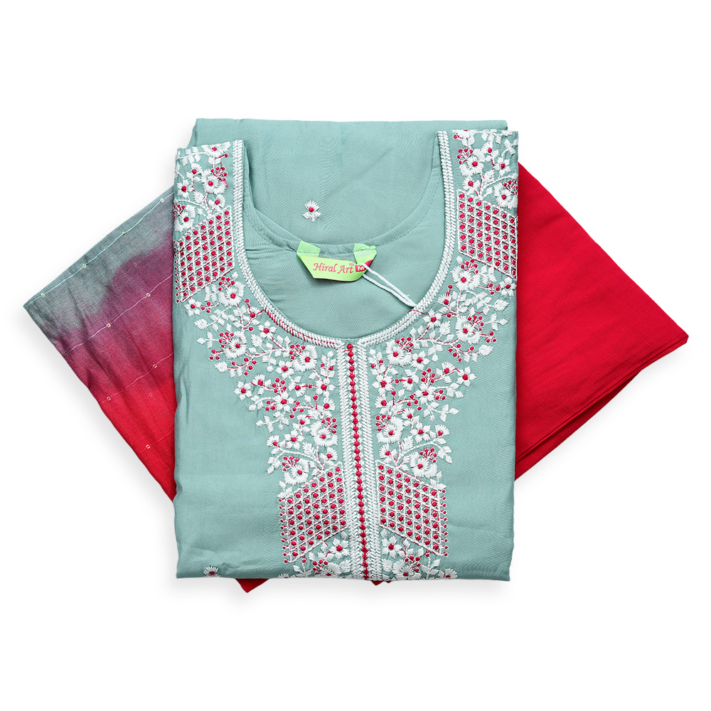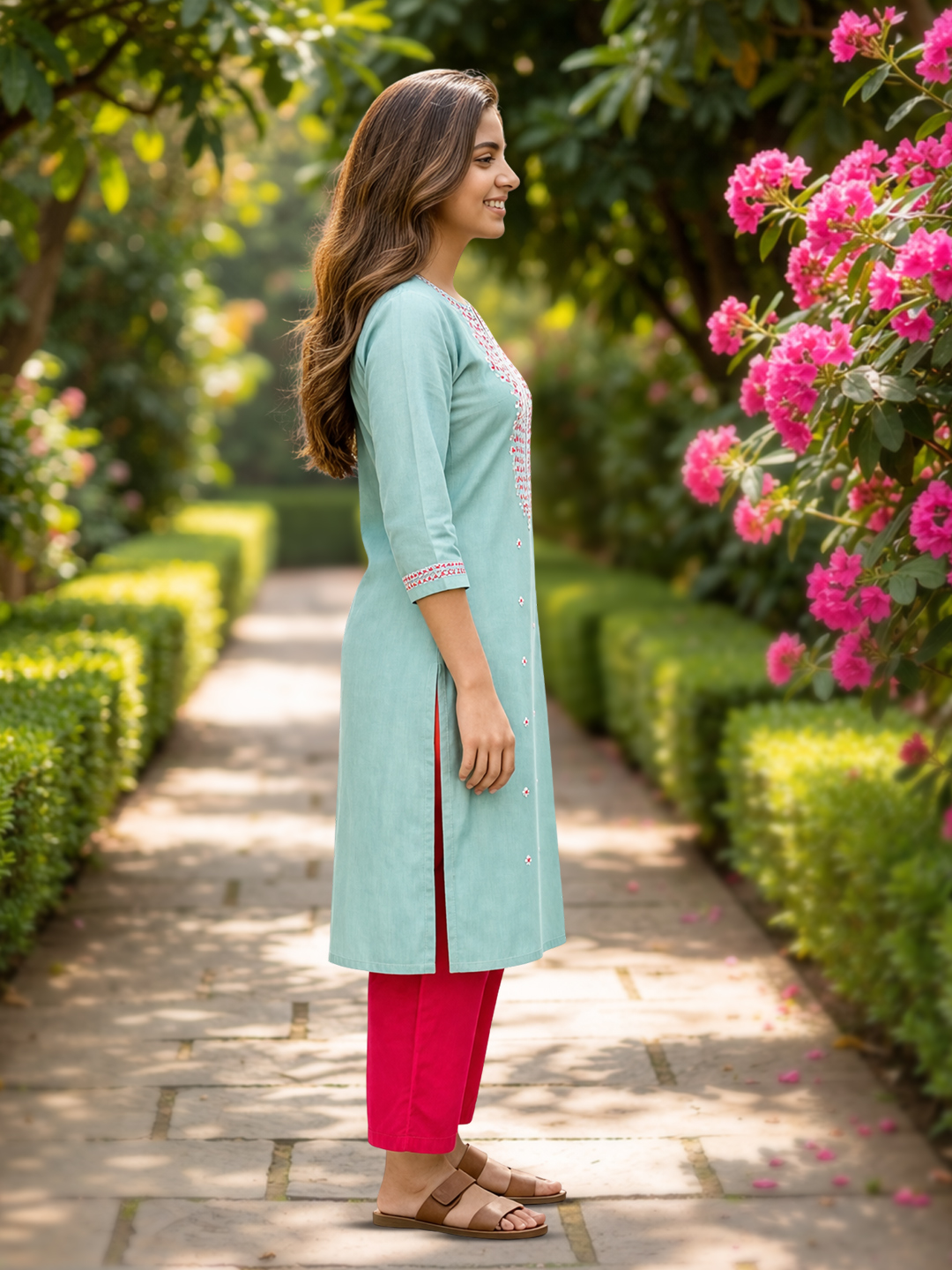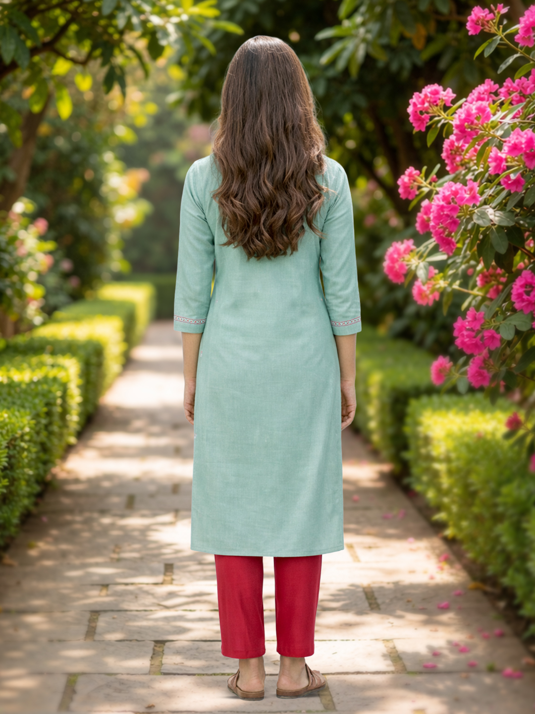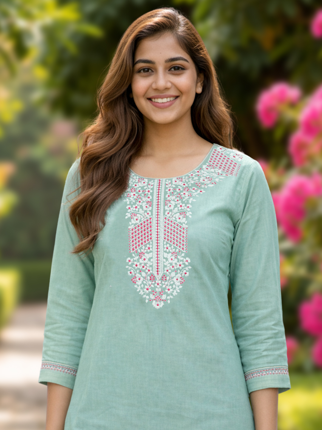 Delicate floral threadwork adorns the neckline and sleeves, adding a touch of sophistication and charm. Perfect for women who love subtle elegance with traditional flair.