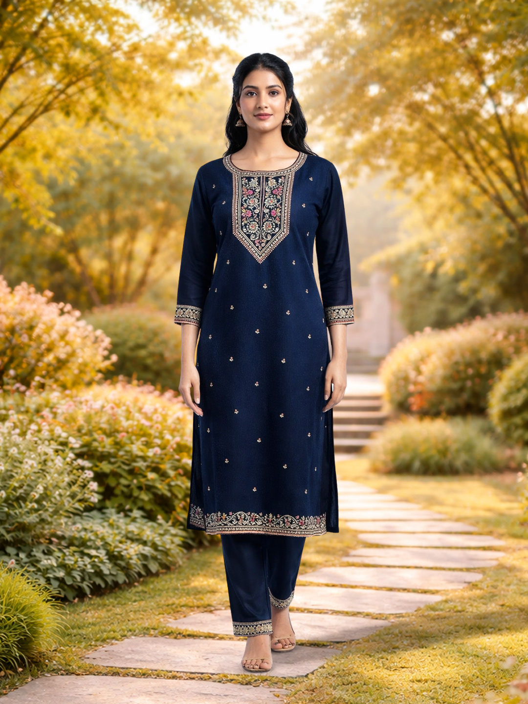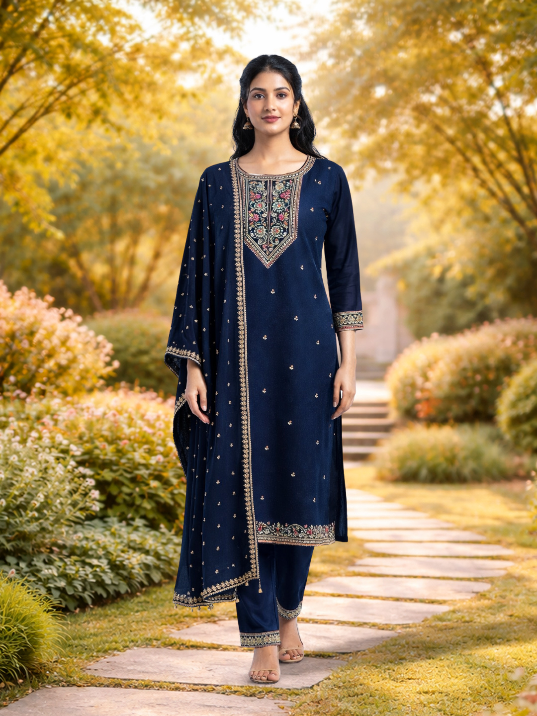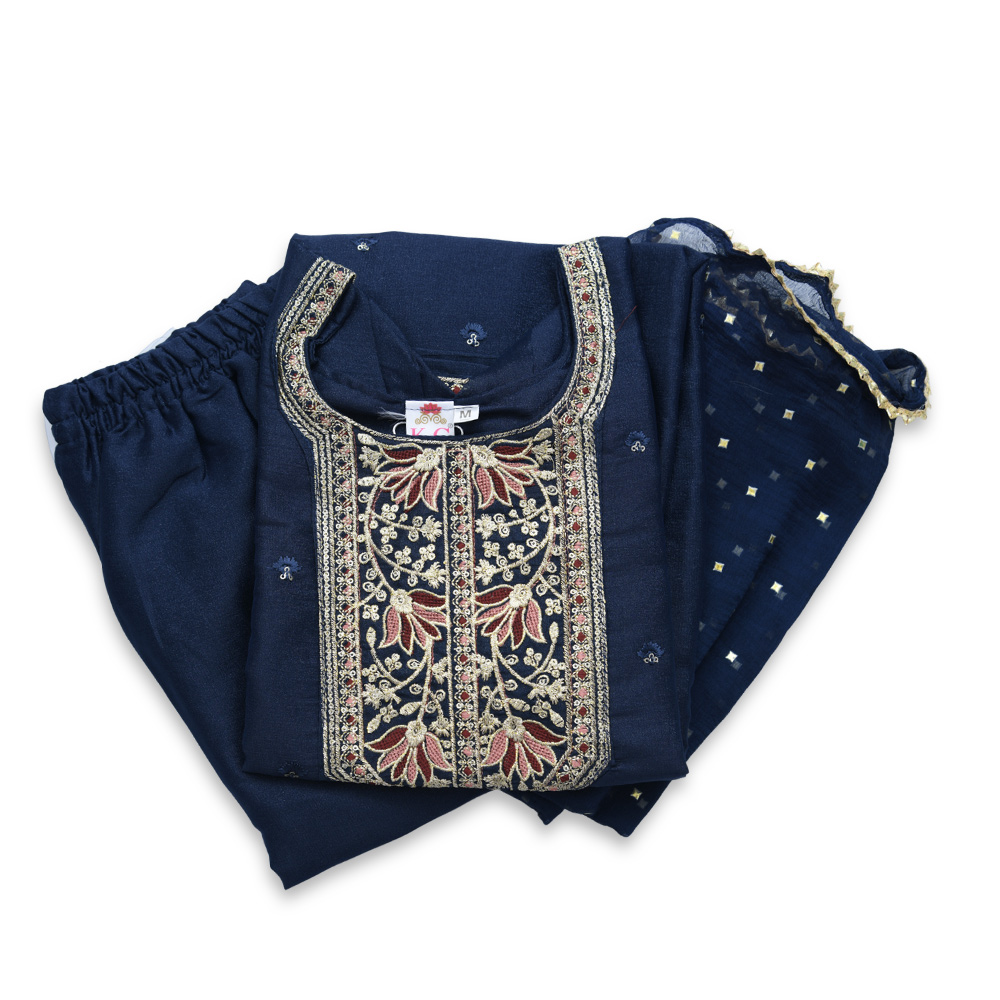 Designed for women who appreciate understated elegance, this salwar suit set combines soft, premium fabric with delicate embroidered motifs. The round neckline with ornate detailing adds a refined touch, perfect for both semi-formal and festive wear.