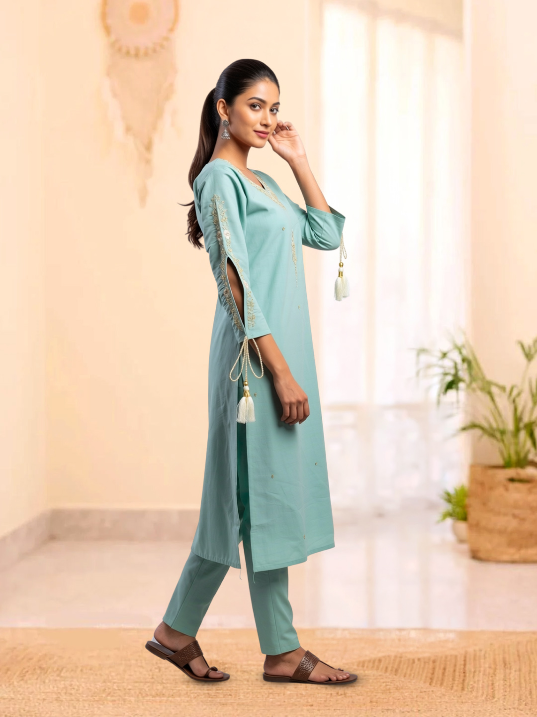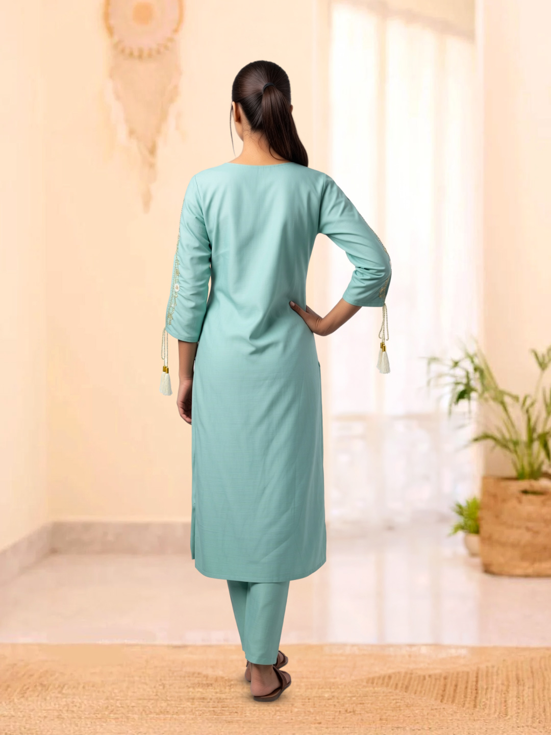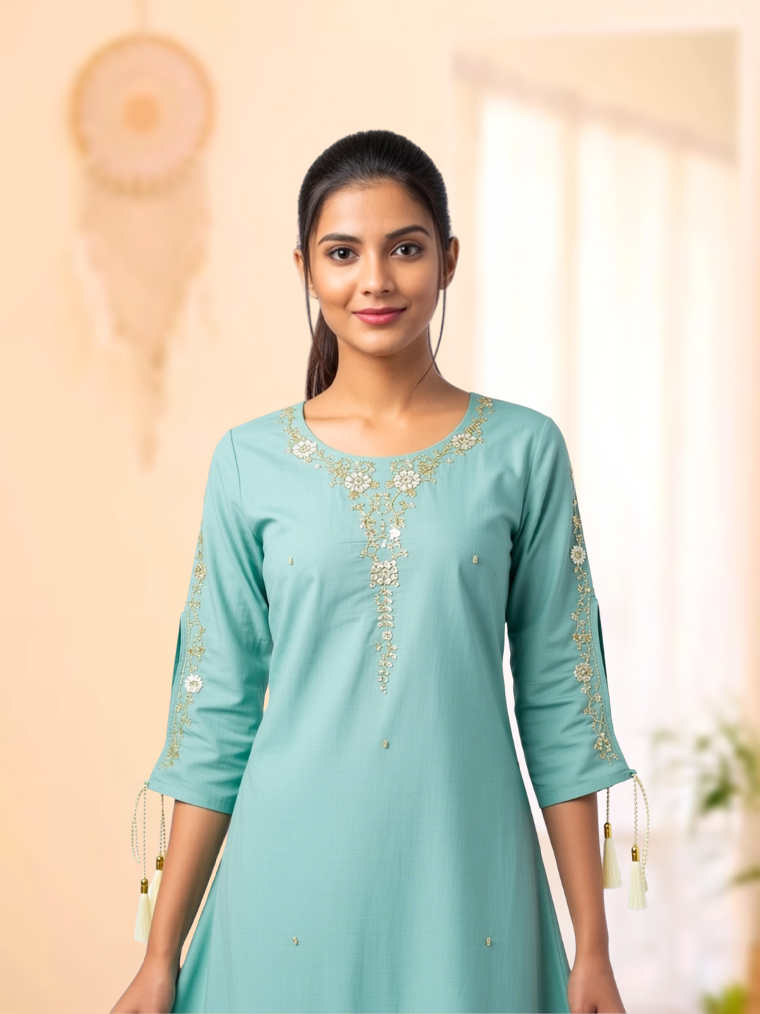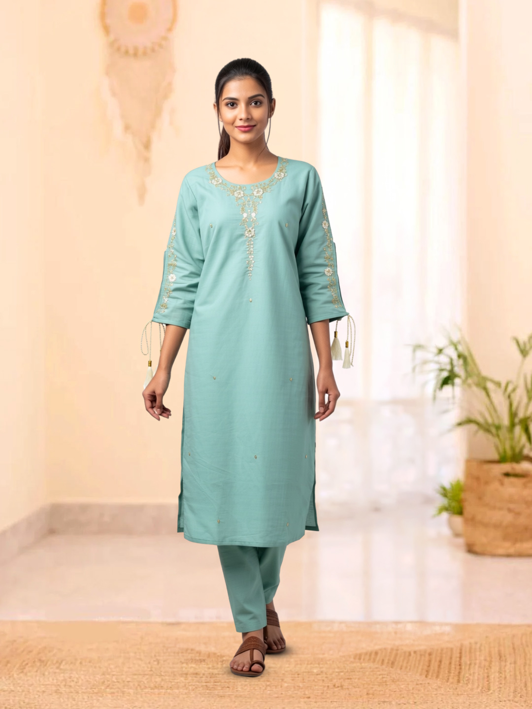 This salwar suit set brings together elegance and intricate craftsmanship. Three-quarter sleeves with tassel tie-ups add a modern touch to the classic embroidered neckline. Pair it with matching pants and a decorative dupatta for a polished outfit perfect for festive events, cultural celebrations, or family functions.