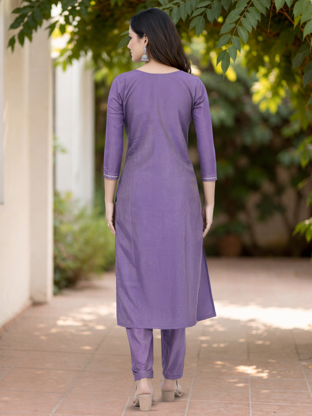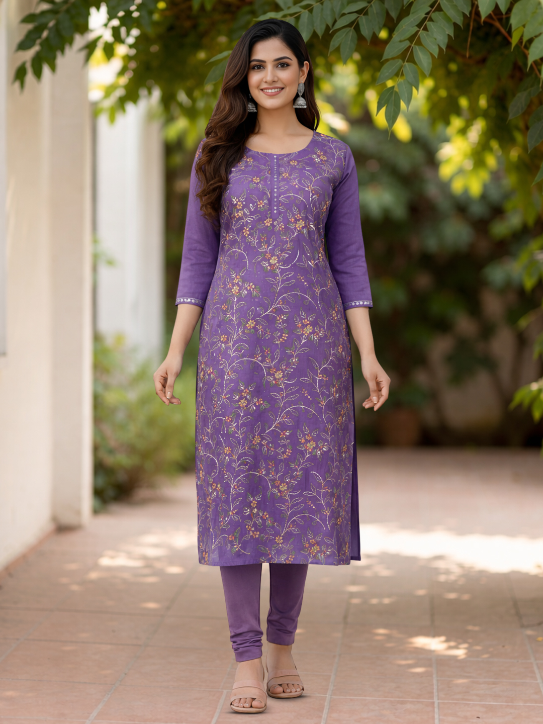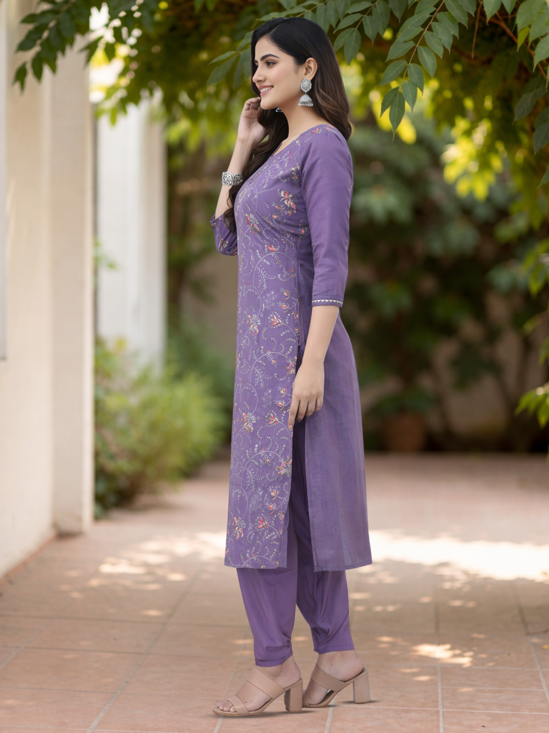 This salwar suit set blends classic embroidery with modern comfort. The intricately detailed floral patterns add a touch of sophistication, while the 3/4 sleeves and straight-cut silhouette offer a flattering fit. Paired with coordinated bottoms and a lightweight dupatta, it’s perfect for both casual and festive wear.