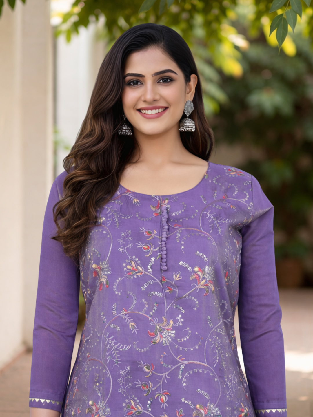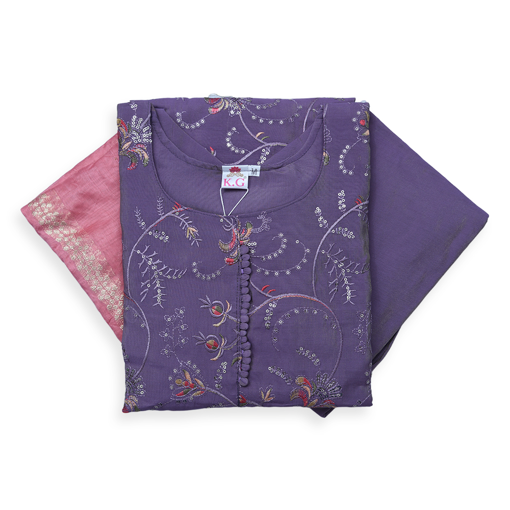 Step into refined elegance with this beautifully crafted salwar suit set. Featuring delicate floral embroidery with sequinned motifs, the kurta exudes grace and charm. Made from premium breathable fabric, it ensures comfort all day long, while the straight-fit pants and contrasting dupatta complete this sophisticated ensemble.