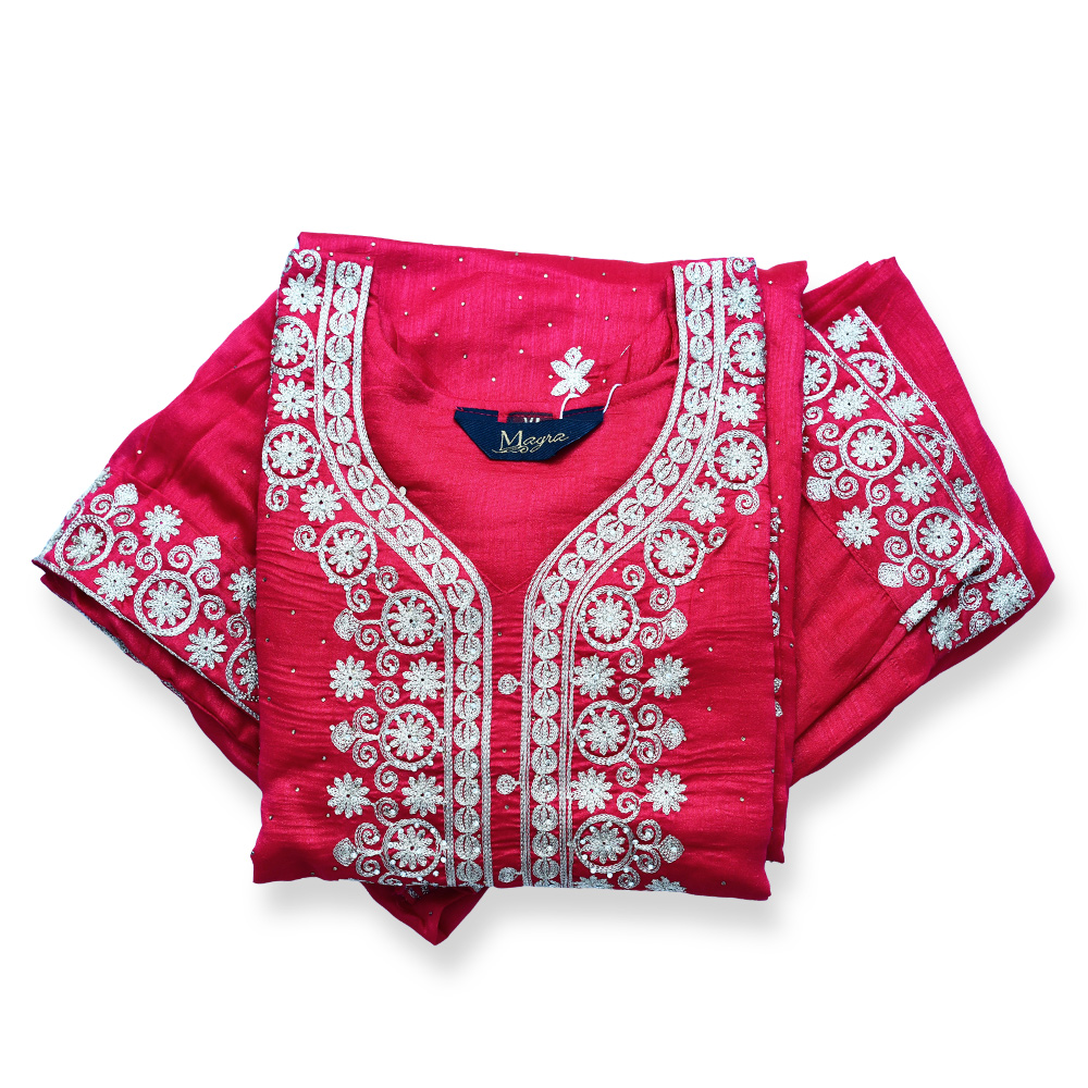 Embrace timeless elegance with this beautifully designed traditional salwar suit set. The straight-cut kurta features a structured silhouette enhanced by intricate embroidery and stone work along the neckline, borders, and hem. Crafted from soft, slightly textured fabric, it ensures all-day comfort while maintaining a refined look. Paired with a matching dupatta adorned with delicate embroidery, this ensemble offers a perfectly coordinated and graceful appearance.