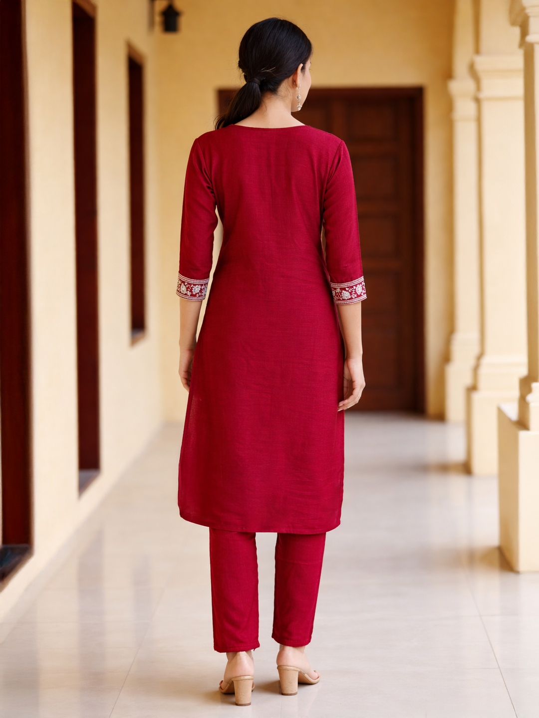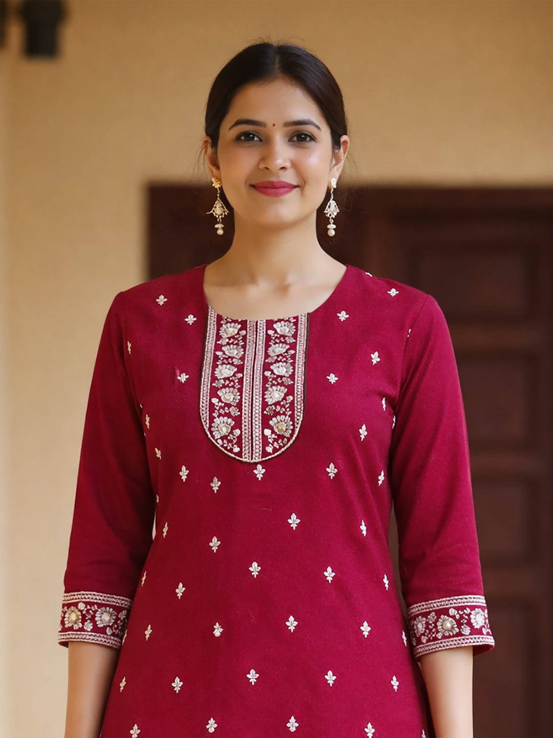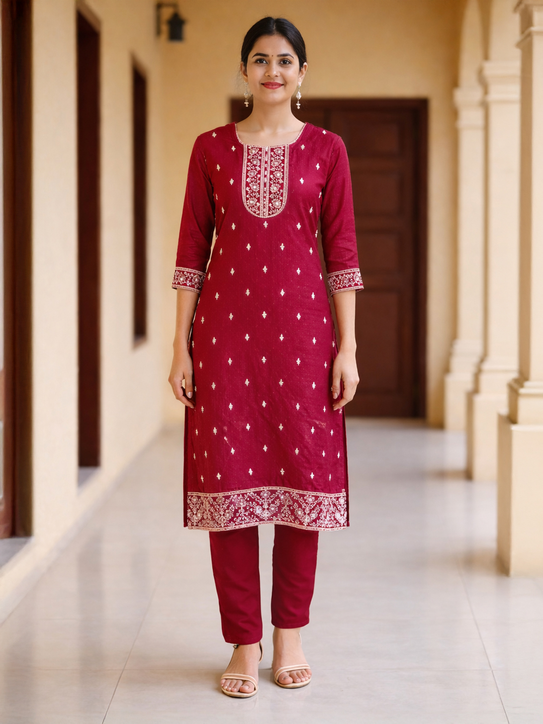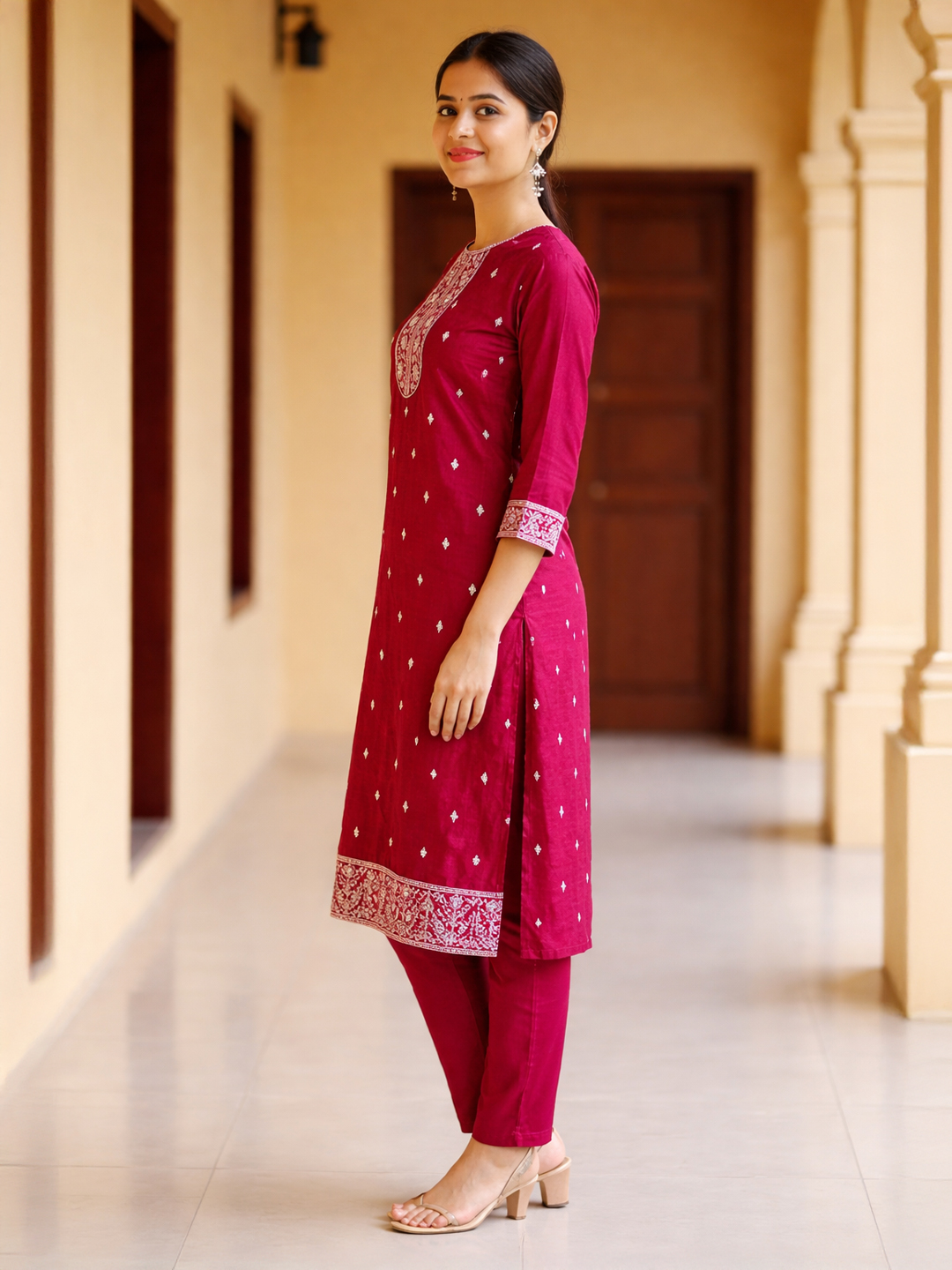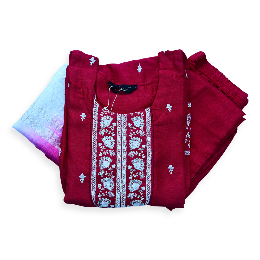 Celebrate traditional elegance with this beautifully crafted salwar suit set. The fine white thread motifs spread gracefully across the kurta, bringing a subtle yet sophisticated ethnic vibe. Perfect for festive gatherings, family events, or casual outings.