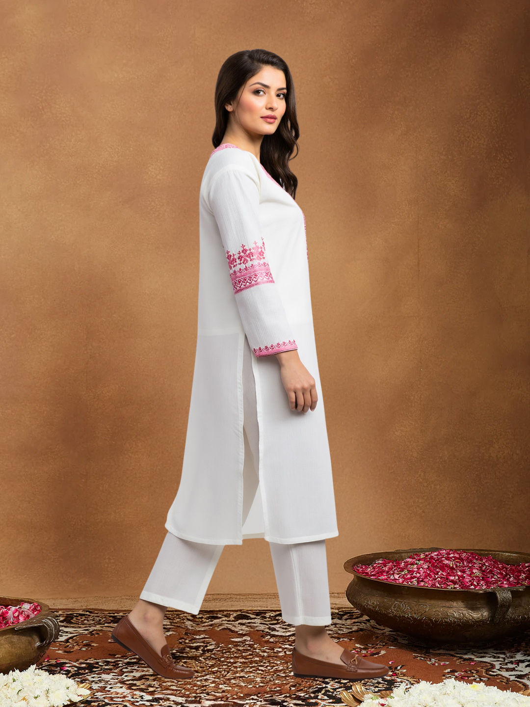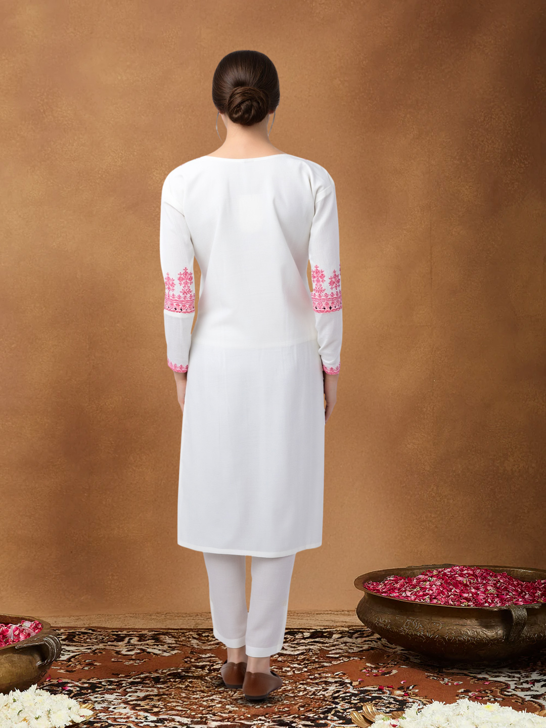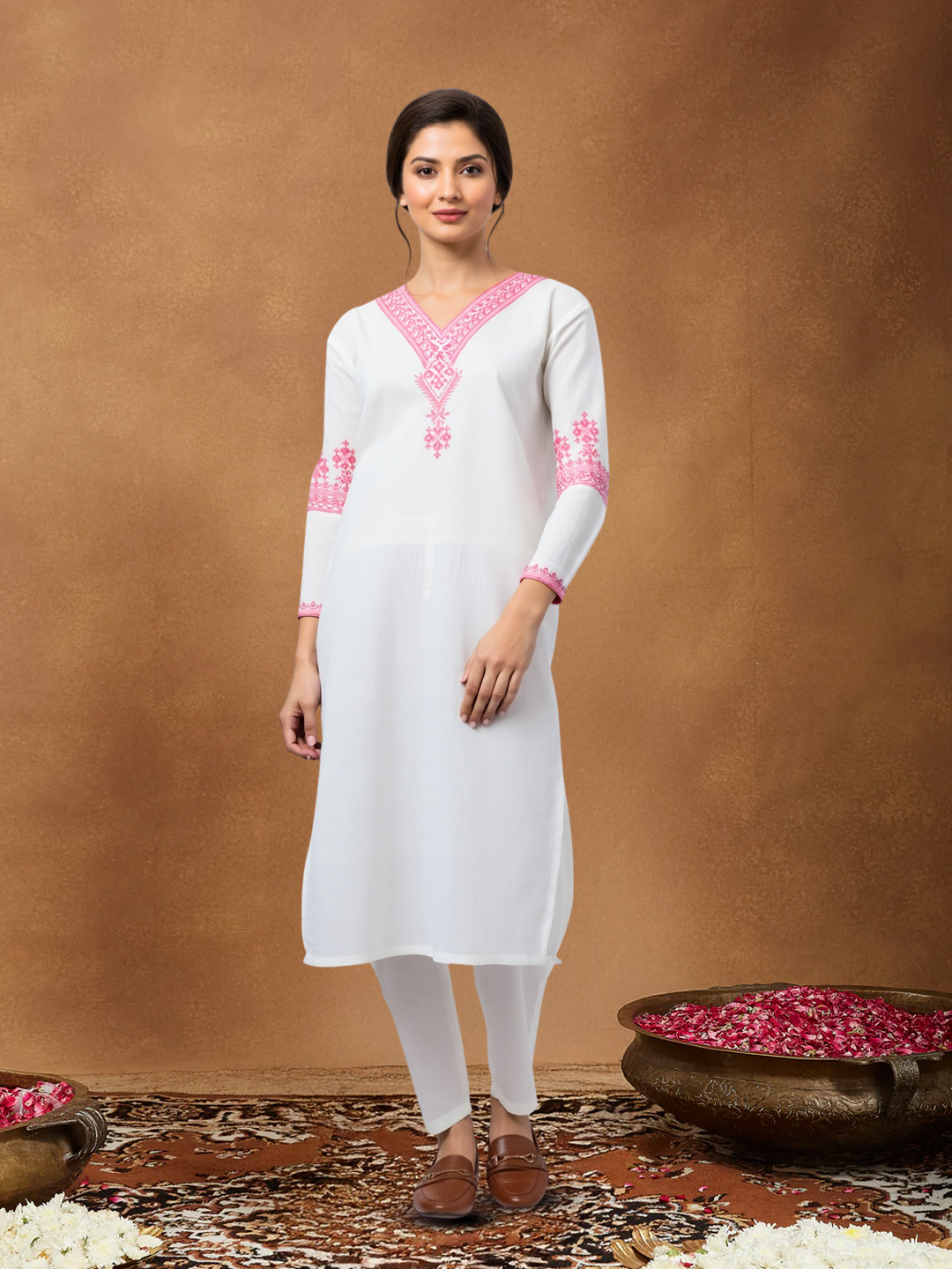Tailored straight pants accompany the kurta, offering a neat and streamlined silhouette that complements the overall ensemble effortlessly.