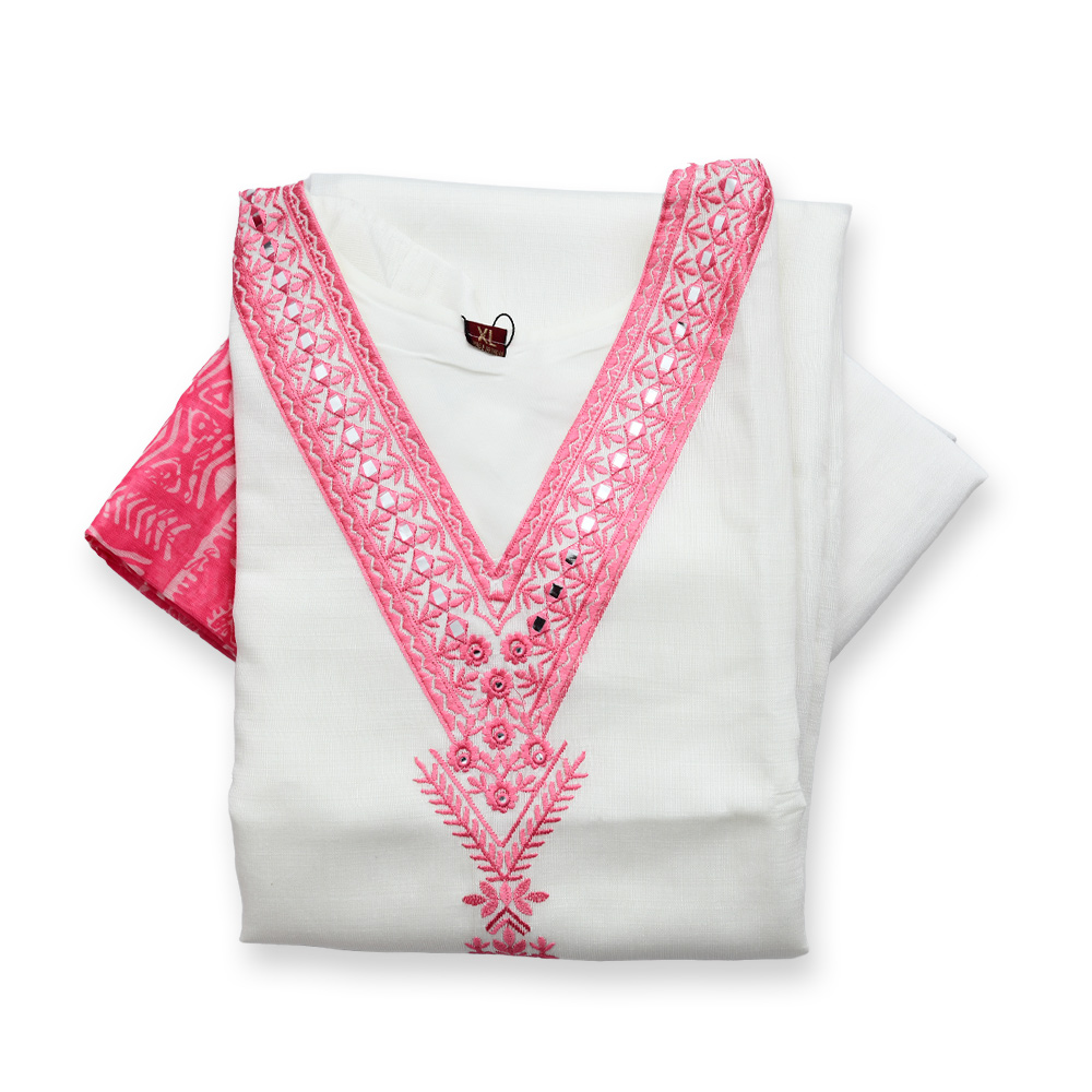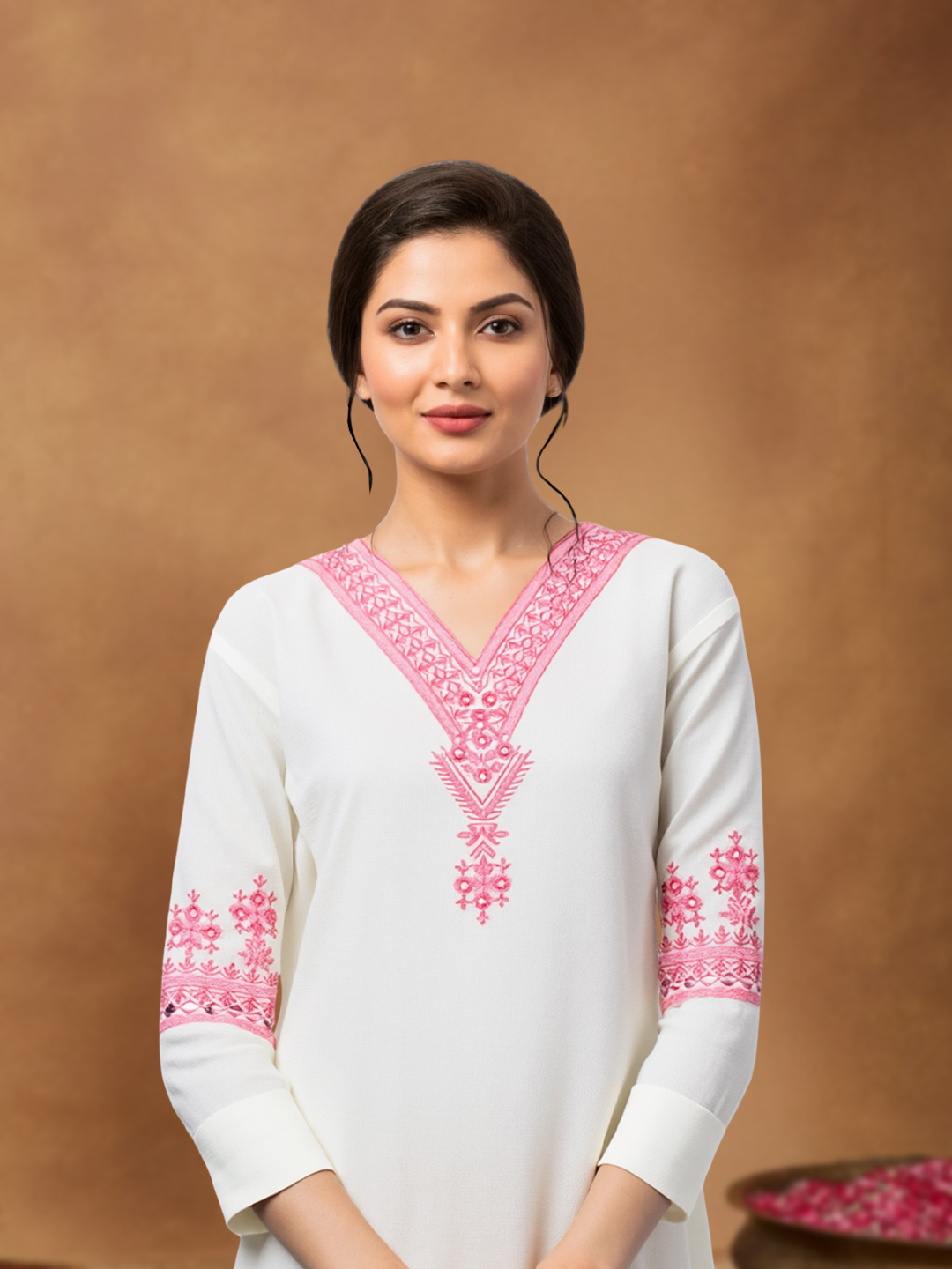 The 3/4 sleeves are beautifully embroidered, balancing elegance with comfort. Perfect for showcasing detailed work while keeping the look refined.