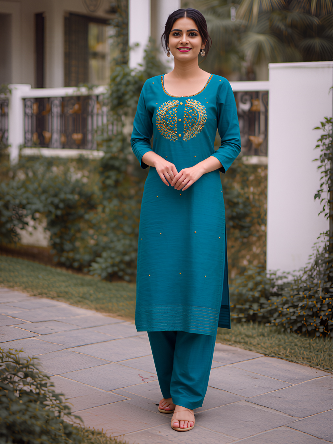 Experience the perfect balance of style and ease. The knee-length kurta with embroidered yoke and subtle golden motifs pairs beautifully with breathable fabric pants and a lightweight dupatta, creating a refined ethnic ensemble for any occasion.