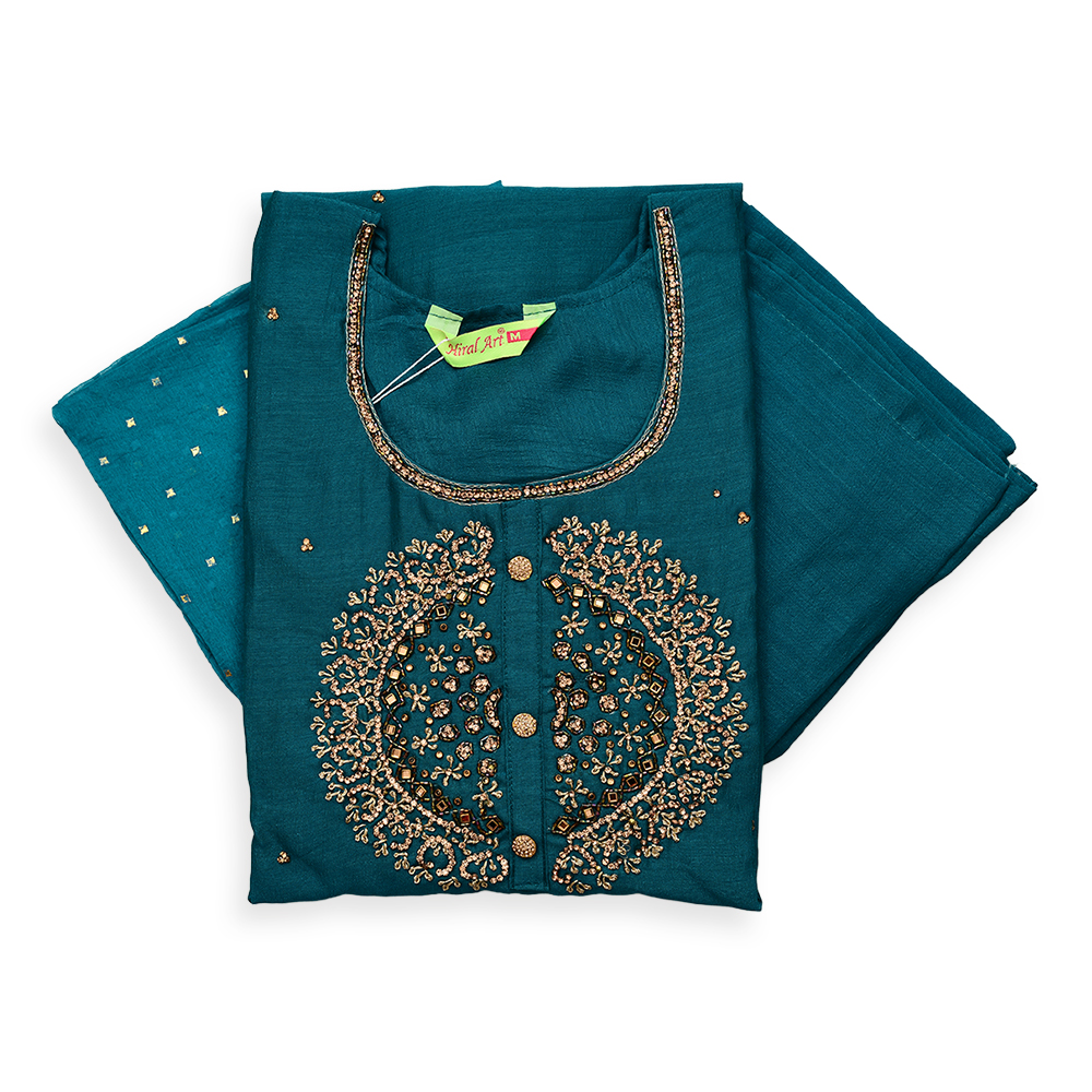 Intricate golden embroidery and small scattered embellishments bring understated glamour to this salwar suit set. The straight-cut kurta and soft, flowy dupatta ensure comfort while exuding traditional sophistication at weddings, festivals, or family gatherings.