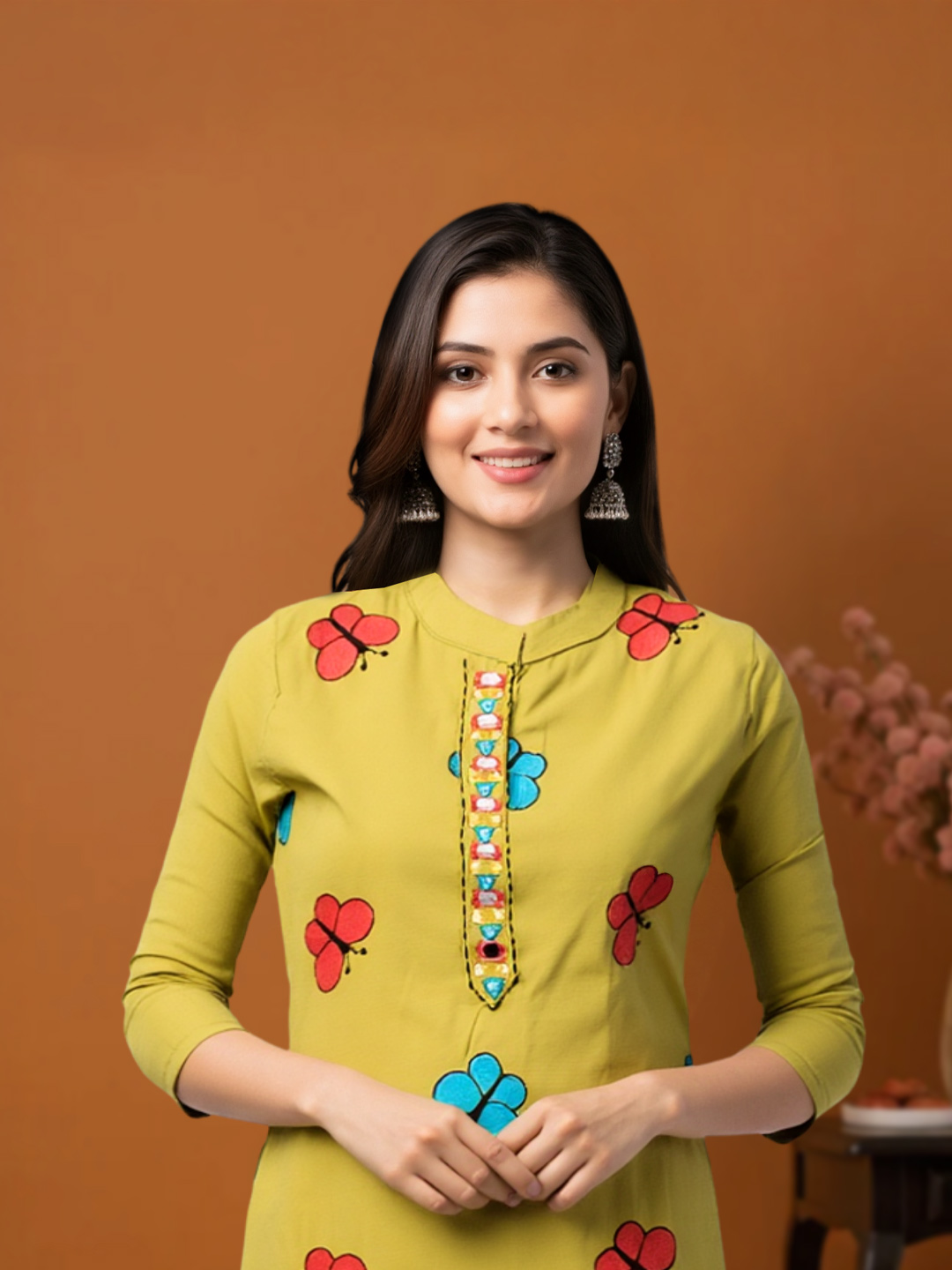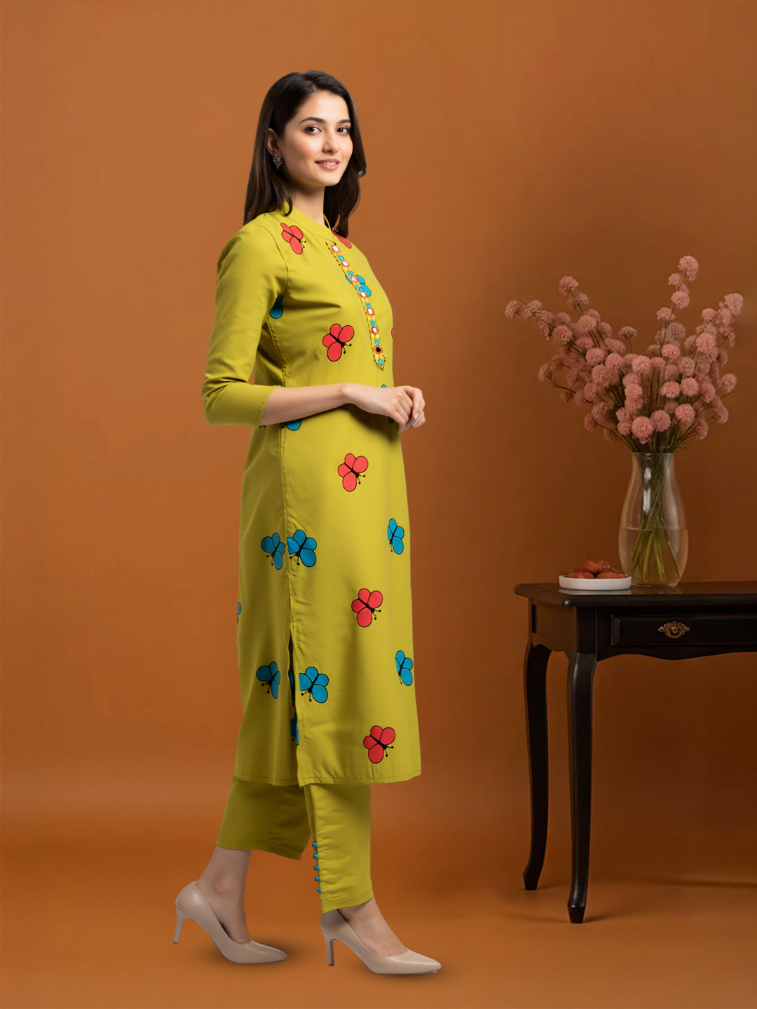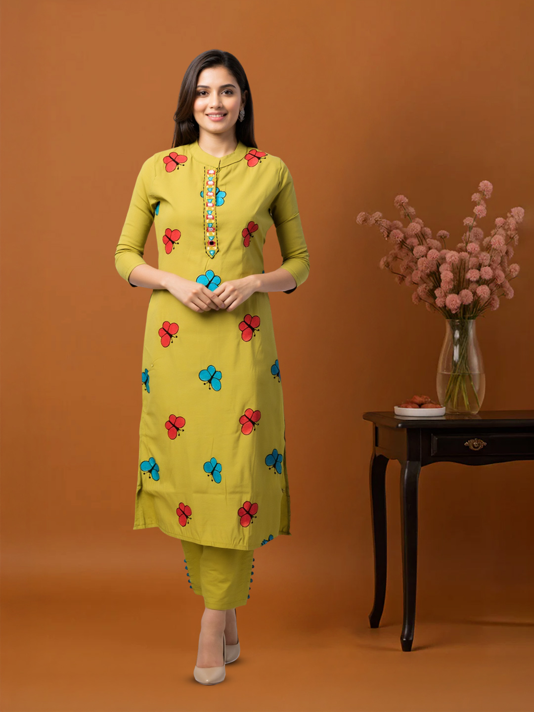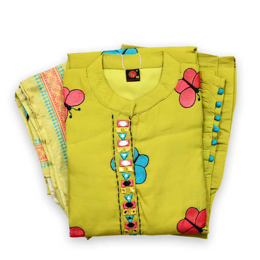 Step out in style with this ethnic salwar suit featuring colorful butterfly motifs. The straight-cut kurta and pants provide a flattering silhouette, and the mandarin collar with multicolored buttons adds a subtle decorative touch. Paired with a beautiful dupatta with woven border, it’s perfect for festive occasions or casual gatherings.