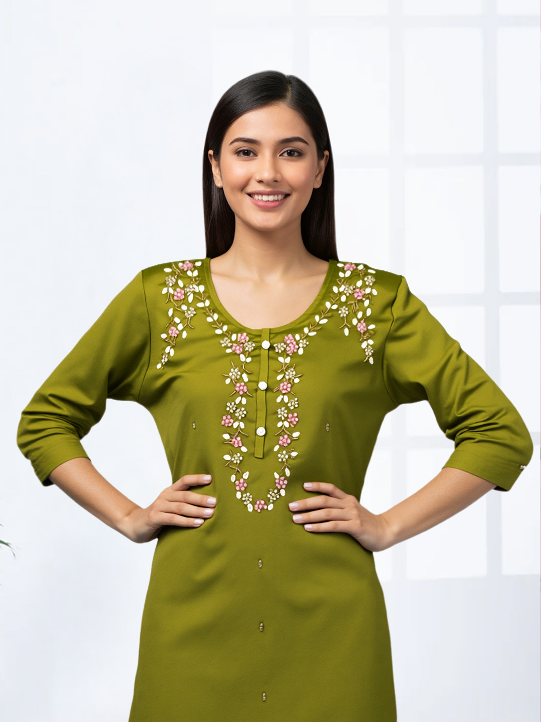 This Ethnic Floral Aari Work Salwar Suit Set blends the best of both worlds—classic Aari embroidery with modern, comfortable styling. The premium fabric provides a luxurious feel, while the straight-cut pant offers an effortless fit. The floral motifs, crafted with delicate handwork, add an element of grace and charm to the overall look. Paired with a traditional dupatta, this outfit is an embodiment of beauty, elegance, and modernity, perfect for your next celebration.