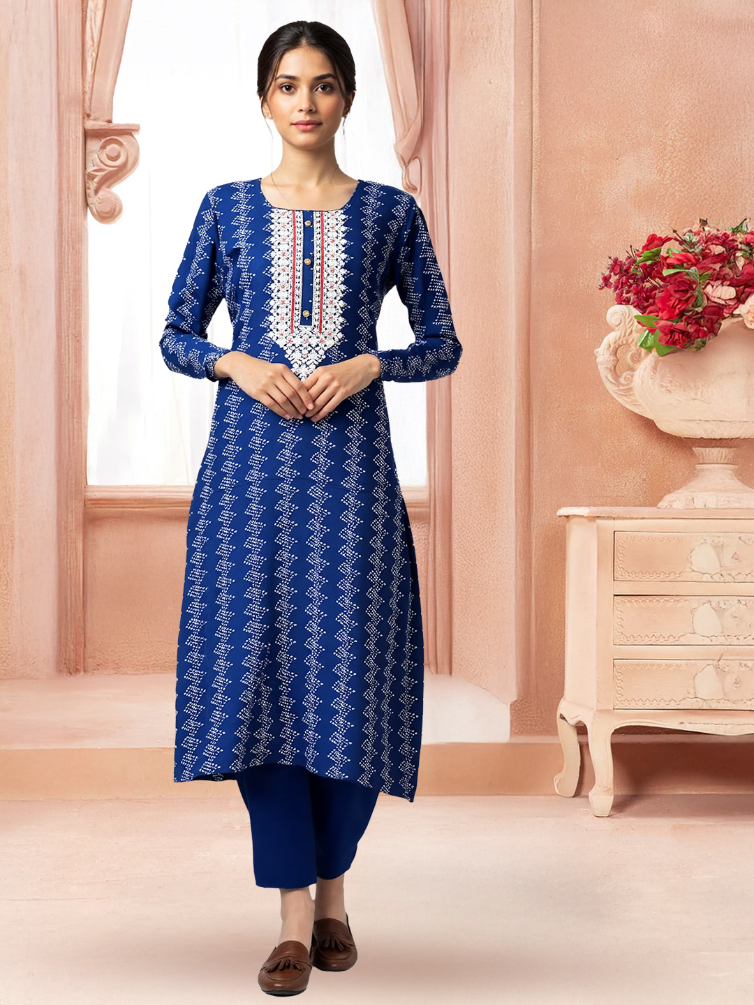 This salwar suit set blends tradition with trendy geometric prints. The embroidered yoke panel on the round neckline and three-quarter sleeves create subtle sophistication, while the straight-cut kurta, solid slim-fit pants, and tassel-detailed dupatta offer a complete, polished ethnic look.