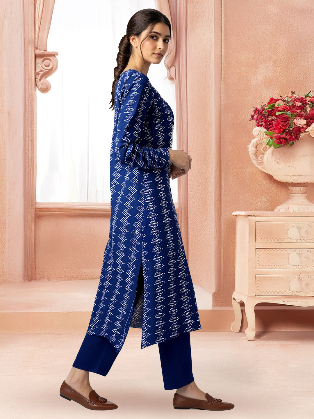Add a touch of modern ethnic charm with this geometric printed salwar suit set. Featuring a round neckline with an embroidered yoke panel and three-quarter sleeves, the straight-cut kurta offers a flattering silhouette. Complete the look with matching slim-fit pants and a coordinated printed dupatta with delicate tassel detailing.