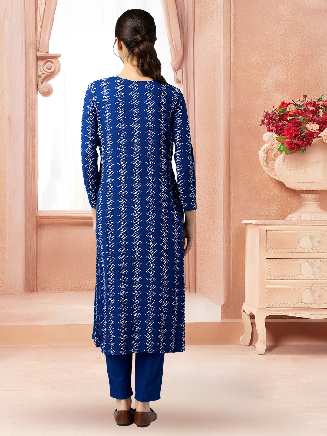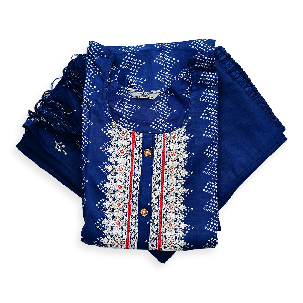 This ethnic salwar suit set combines geometric prints with delicate embroidery for a stylish look. The straight-cut kurta and three-quarter sleeves ensure a flattering fit, while the matching slim-fit pants and tassel-accented dupatta make it a perfect ensemble for everyday or festive wear.
