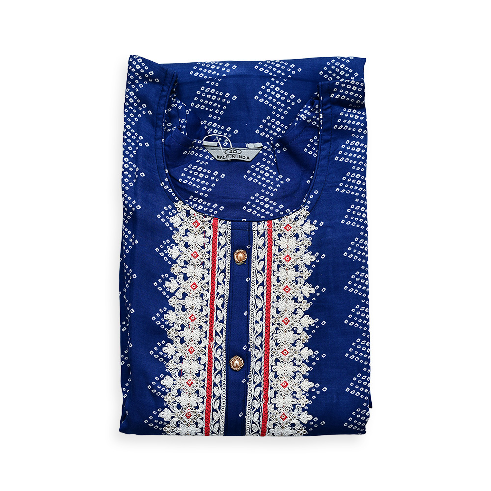 Perfect for cultural gatherings or casual celebrations, this straight-cut kurta features ethnic geometric prints and an embroidered neckline yoke. Paired with matching slim-fit pants and a coordinated dupatta with playful tassels, it offers comfort and style in equal measure.
