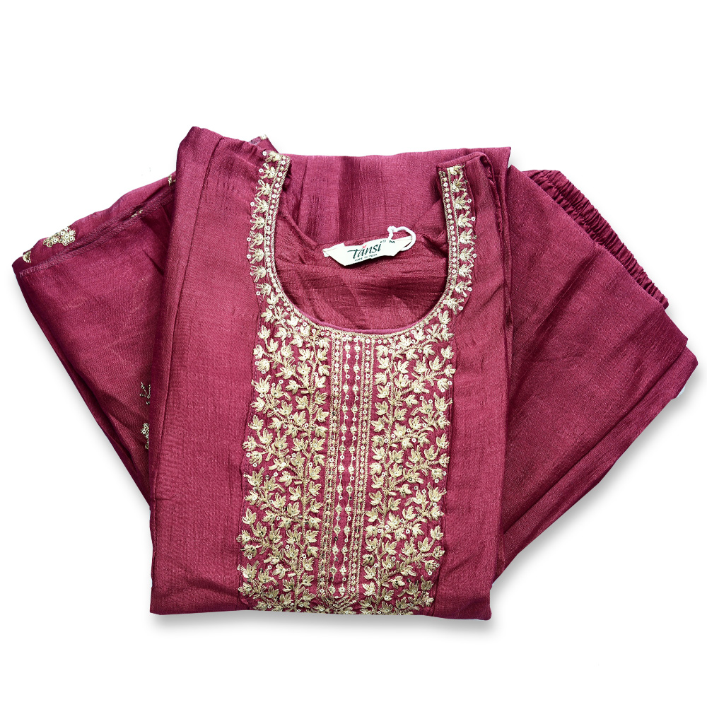 This embroidered Anarkali suit set is a tribute to classic artistry and graceful silhouettes. The kurta’s flared design is elevated by a rich embroidered border along the hem, creating a striking visual statement. Elegant three-quarter sleeves with detailed edging lend a polished touch. Complemented by matching trousers with subtle hem embellishments and a floral-embroidered dupatta, the outfit blends comfort, softness, and luxurious sheen for special occasions.