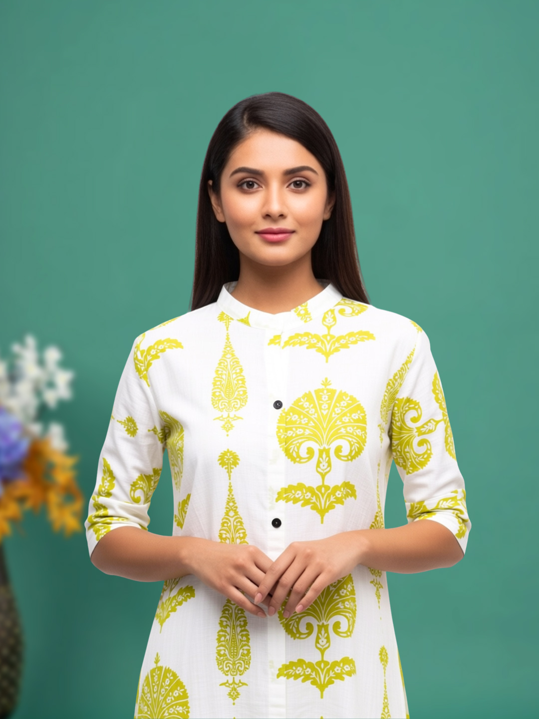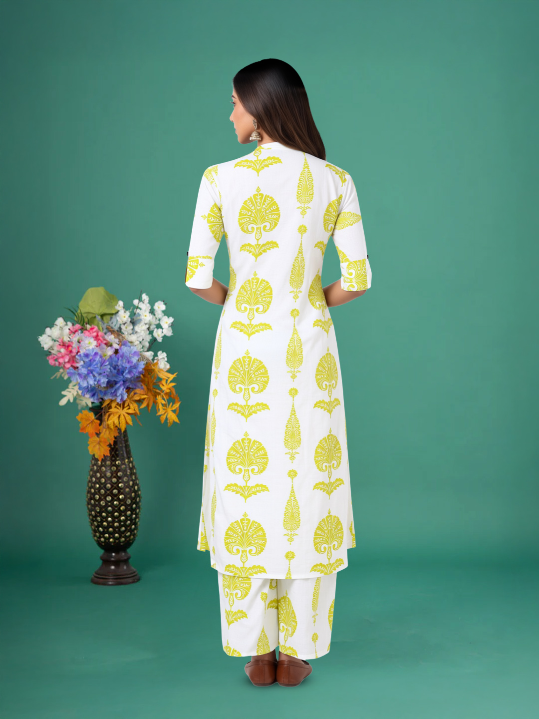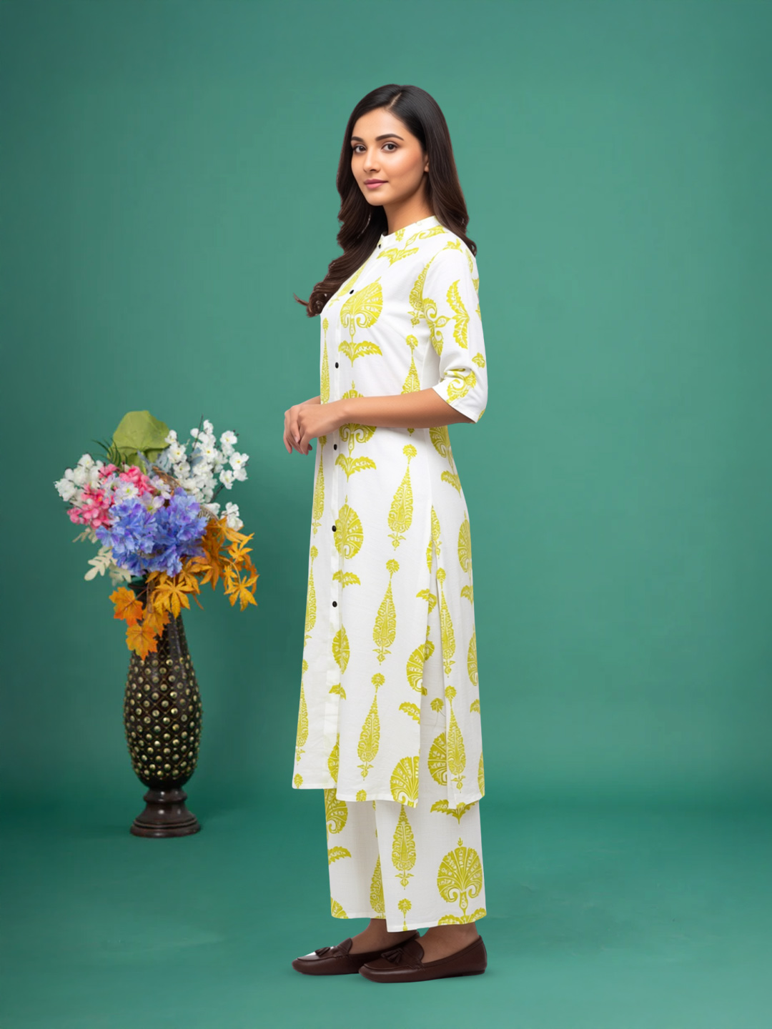Turn heads in this kurta-palazzo co-ord set featuring a white base with vibrant yellow ethnic motifs. Crafted from soft, breathable fabric, it keeps you comfortable all day. The mandarin collar and full button-down front add a modern touch, while three-quarter sleeves with button detailing complete the elegant look.