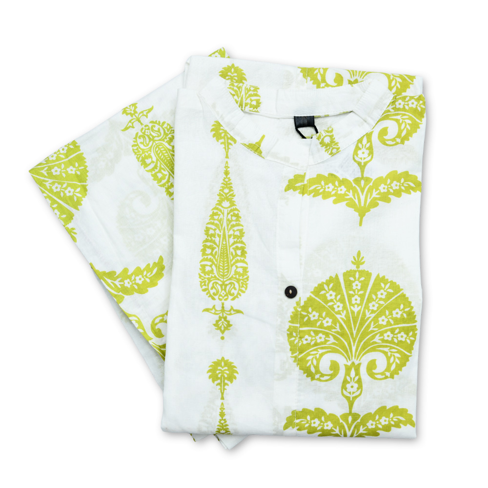 Elevate your ethnic wardrobe with this kurta-palazzo set. The soft, breathable fabric ensures comfort, while the bright yellow motifs on a white base bring freshness and charm. The mandarin collar, button-down front, and relaxed fit make it a versatile choice for both casual and festive wear.