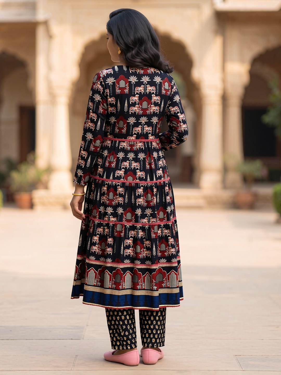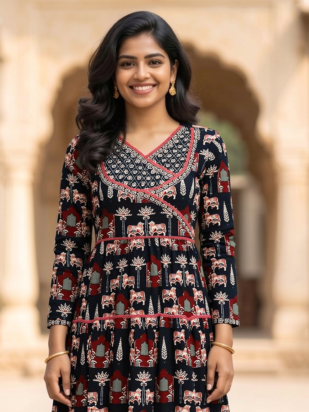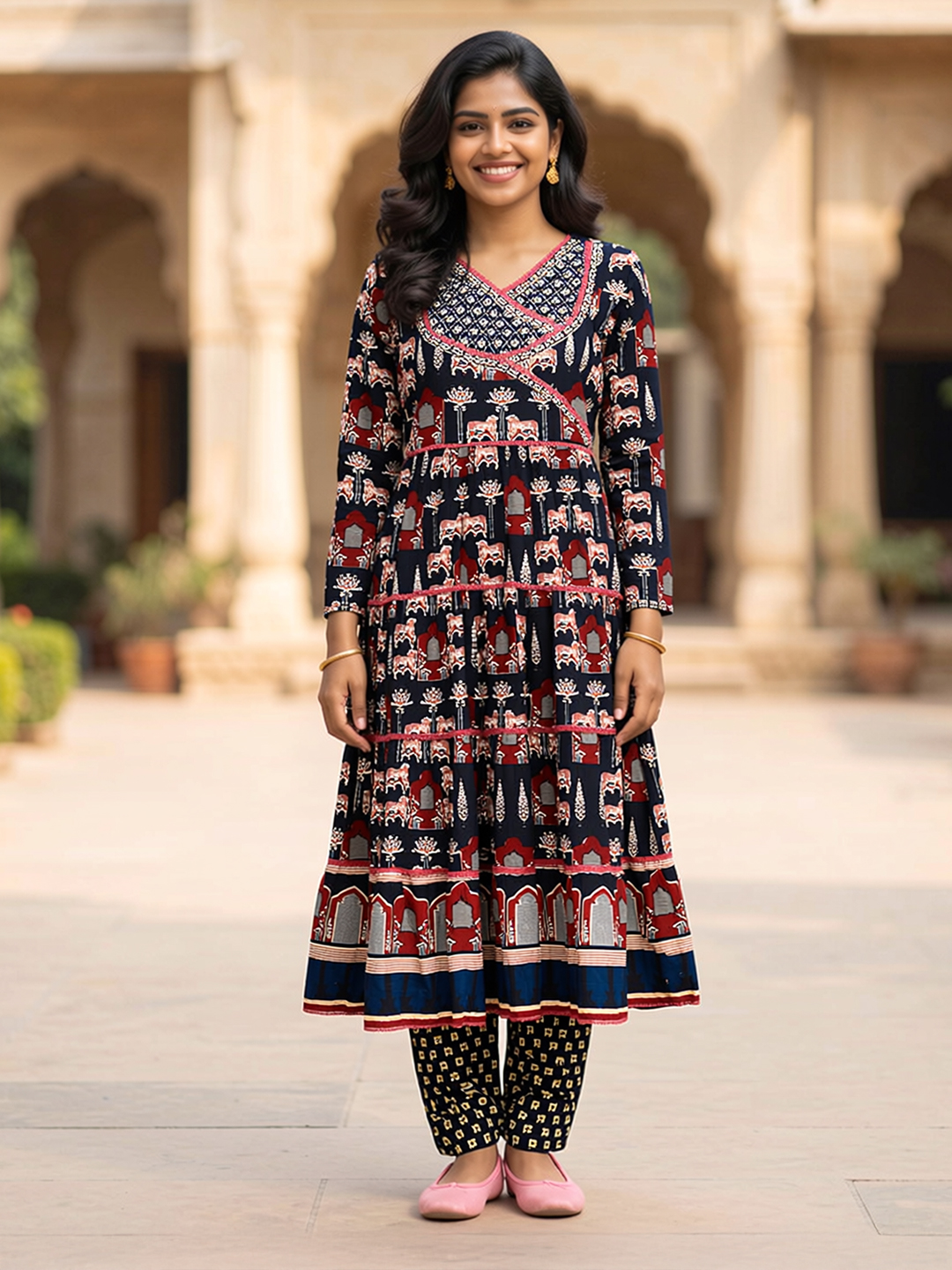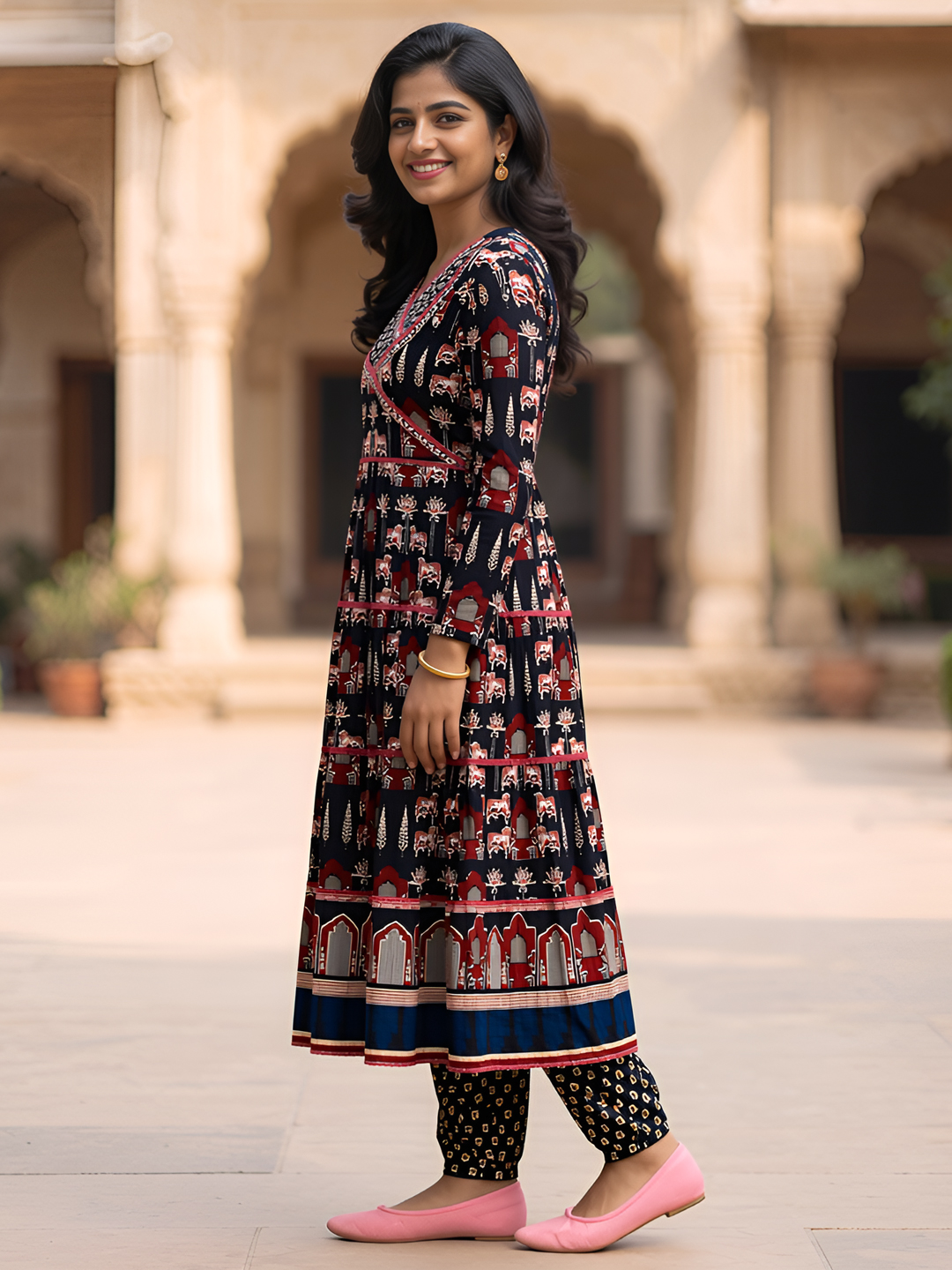 Celebrate timeless tradition with this ethnic print Anarkali kurta set, beautifully adorned with intricate motifs inspired by classic heritage art. The wrap-style neckline adds a modern twist, while the flared silhouette creates a graceful, flowing look. Crafted from soft, breathable fabric and paired with matching bottoms and a lightweight dupatta, it’s perfect for festive and cultural occasions.