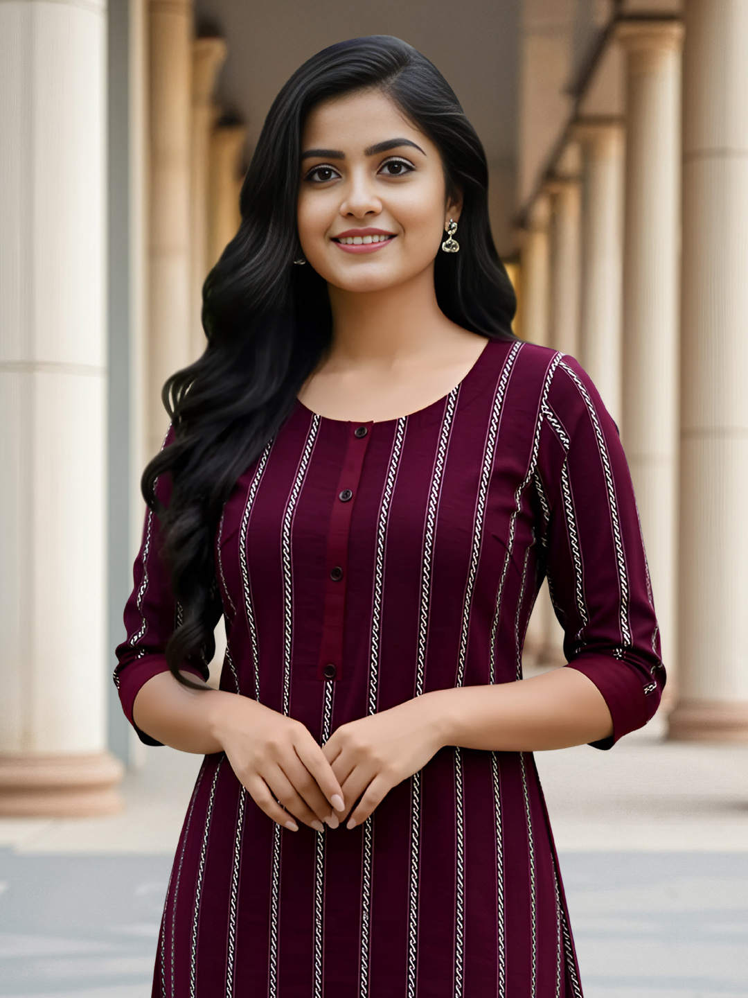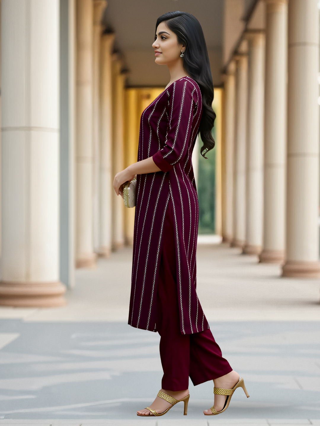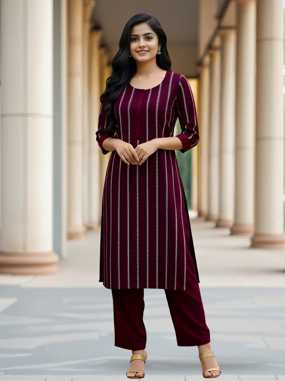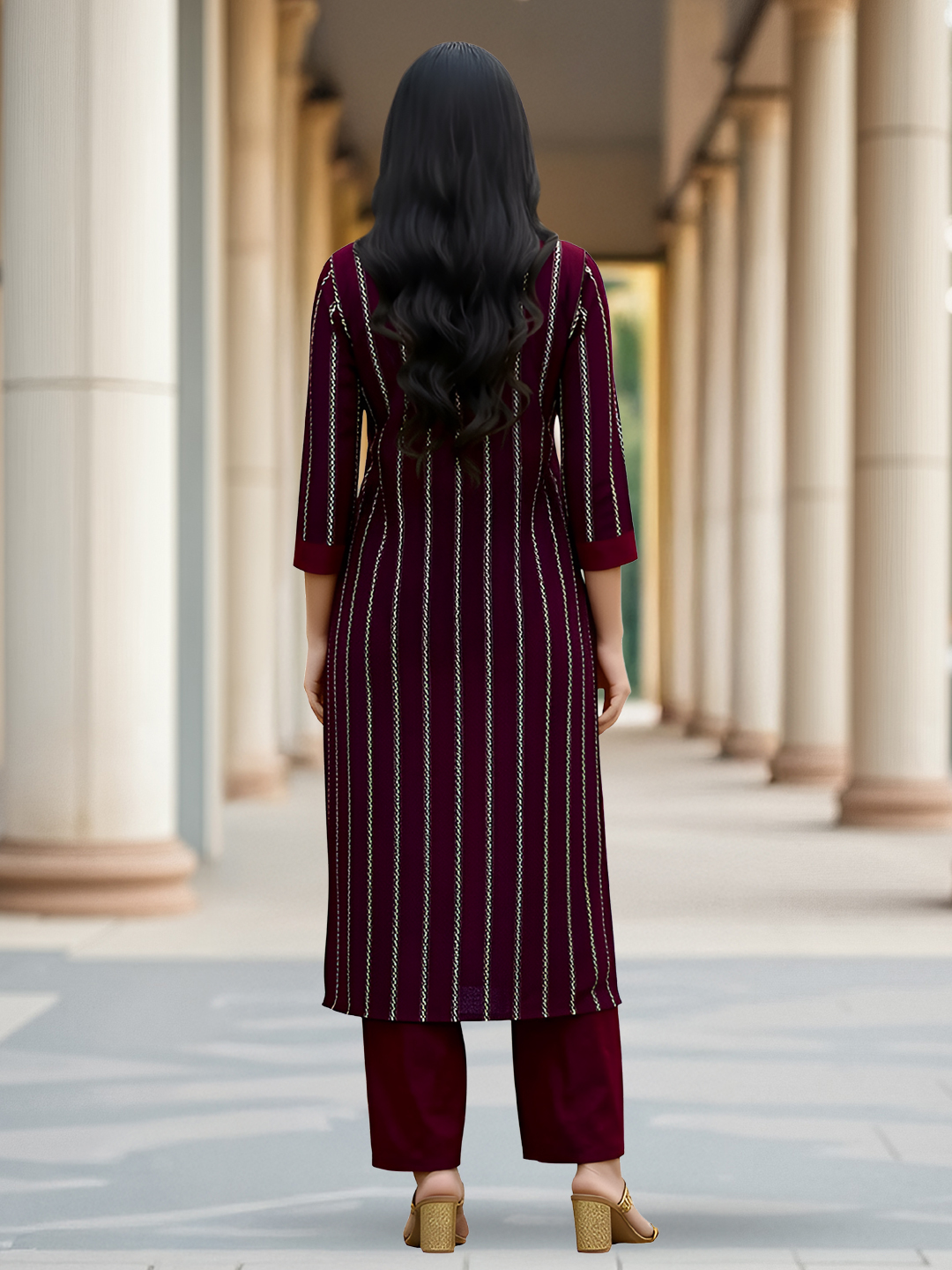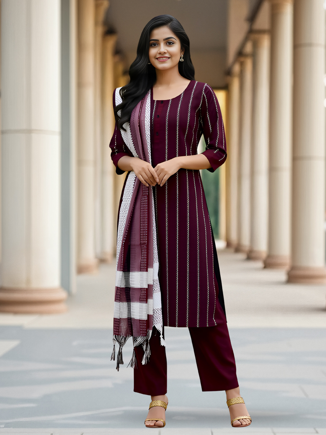 Designed for modern women who appreciate comfort and style, this straight-cut salwar suit set blends simplicity with sophistication. The woven vertical stripe detailing creates a flattering, elongated silhouette, while the round neckline with a subtle button placket adds understated charm. Paired with coordinated straight-fit pants and a tassel-accented woven dupatta, this ensemble is perfect for work, casual outings, and intimate gatherings.