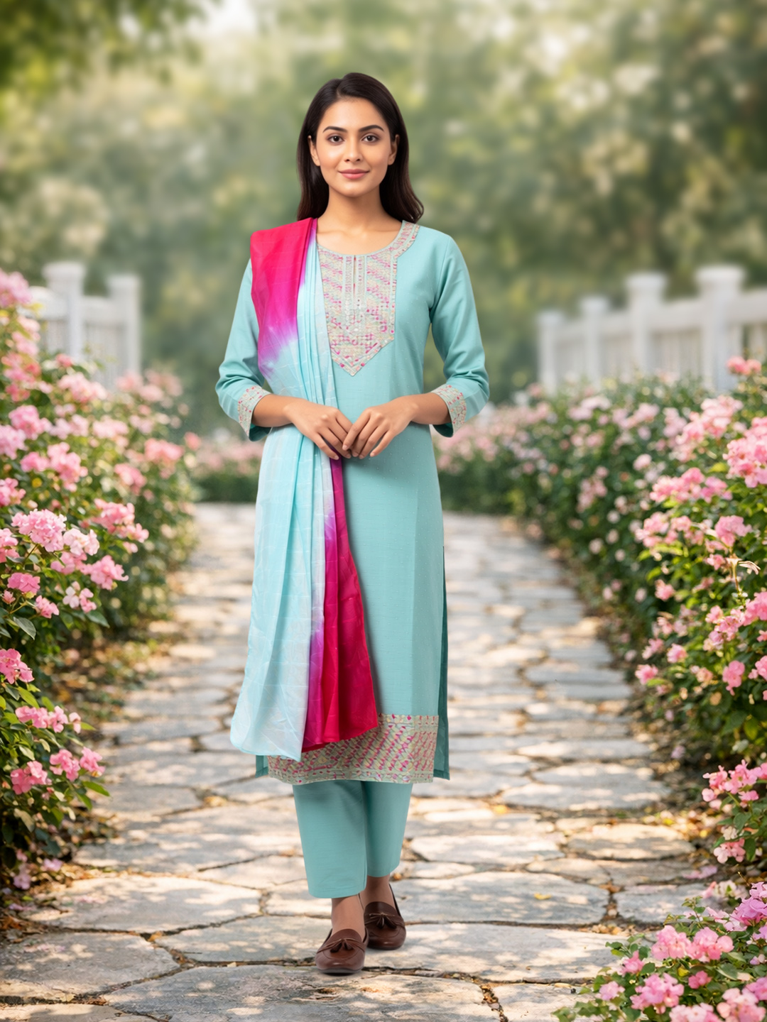 This straight-cut kurta features detailed embroidery on the neckline and cuffs, paired with coordinating pants for a harmonious ensemble. The airy, lightweight dupatta with subtle ombré highlights adds a fresh pop of color to your ethnic wardrobe.