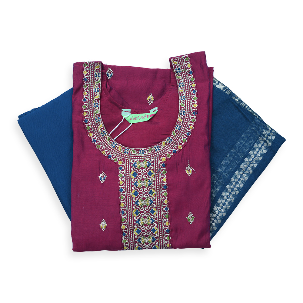 This salwar suit set is a perfect blend of tradition and contemporary style. The premium breathable fabric keeps you comfortable, while the intricate embroidery on the neckline and cuffs adds a luxurious touch. Complemented by a beautifully woven dupatta and coordinated bottoms, it creates a complete and graceful outfit.