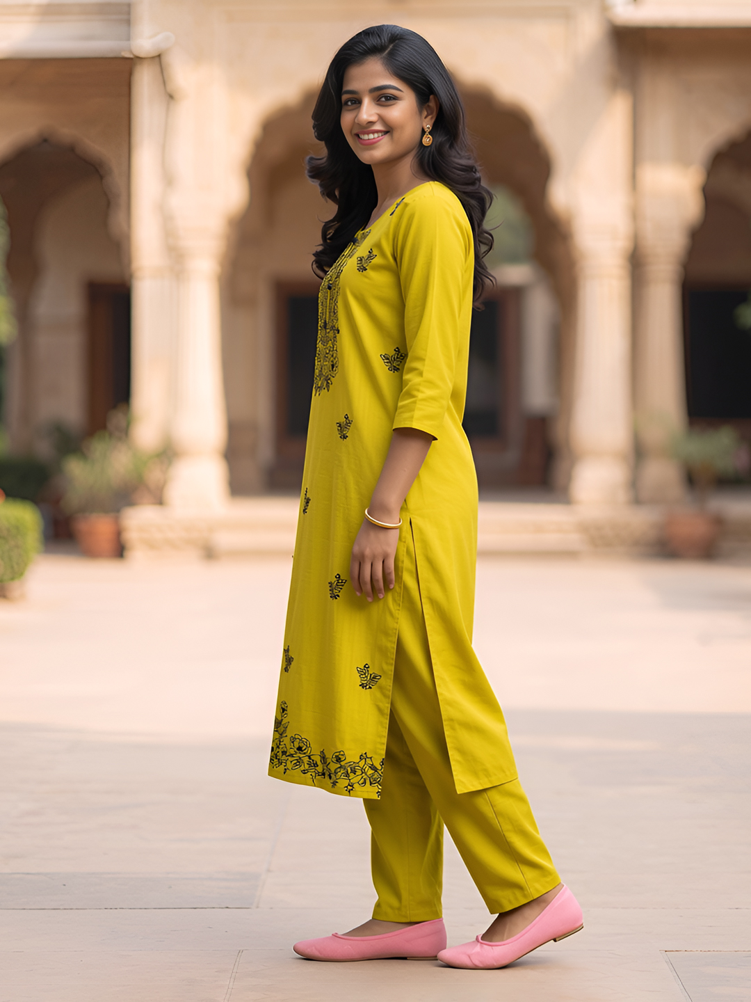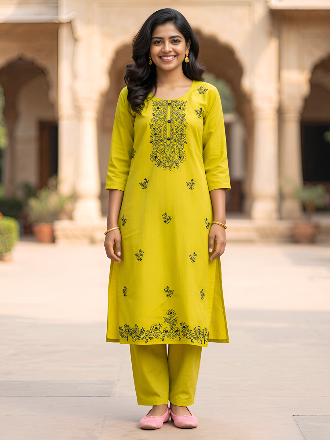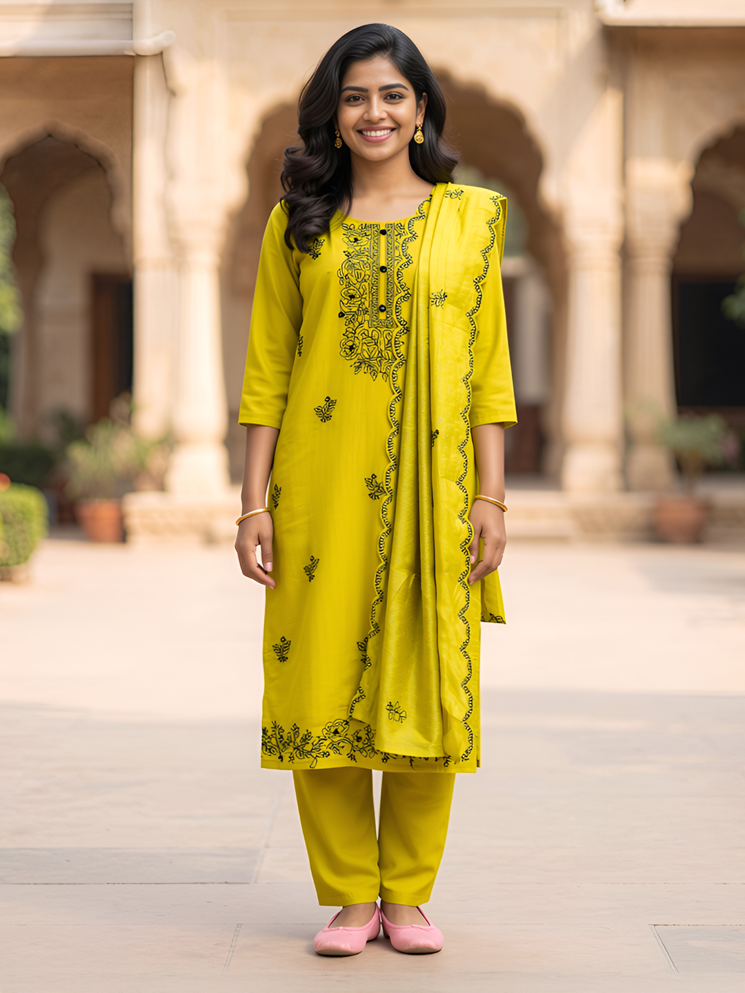Step into grace with this Ethnic Threadwork Salwar Suit Set. Featuring delicate black floral embroidery on a vibrant lime green kurta, paired with straight-fit pants and a beautifully scalloped dupatta, this ensemble blends tradition with modern charm. Perfect for festivals, family gatherings, or casual celebrations.