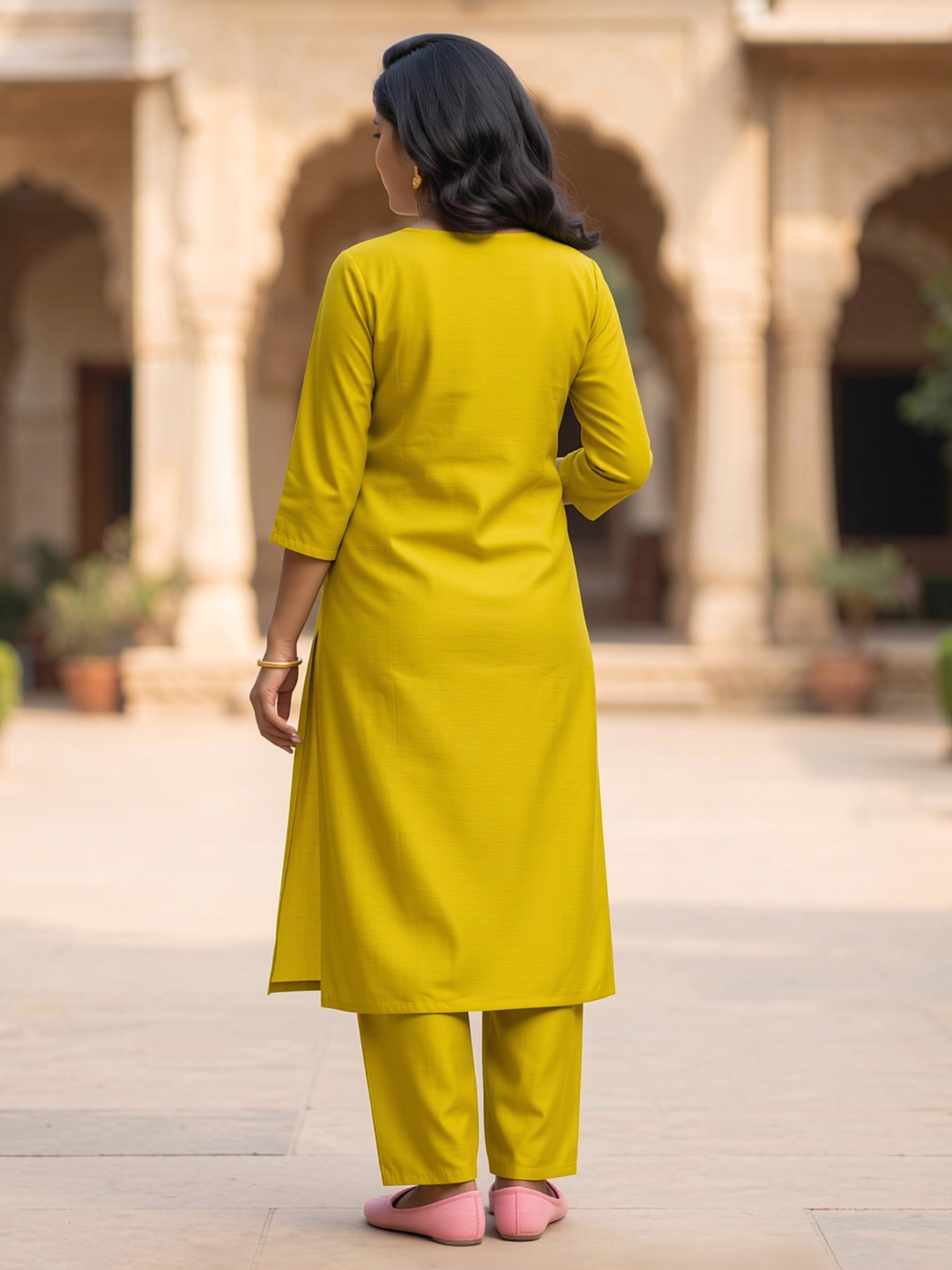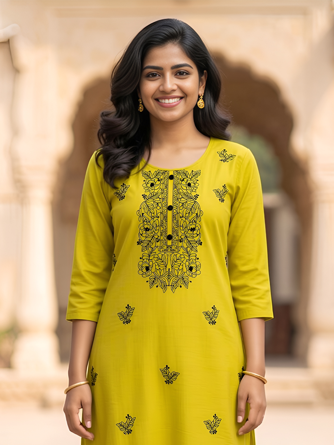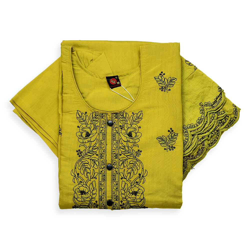 Step into grace with this Ethnic Threadwork Salwar Suit Set. Featuring delicate black floral embroidery on a vibrant lime green kurta, paired with straight-fit pants and a beautifully scalloped dupatta, this ensemble blends tradition with modern charm. Perfect for festivals, family gatherings, or casual celebrations.
