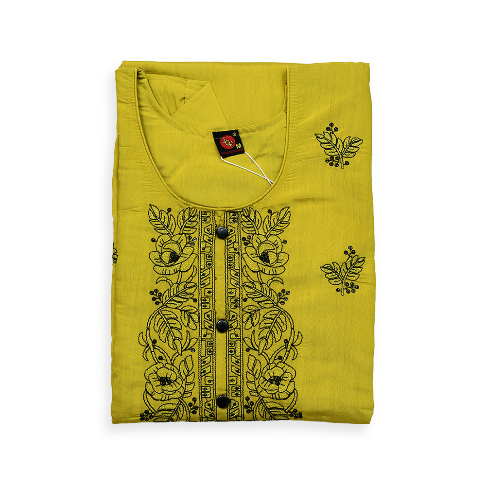Embrace tradition with a touch of modern elegance. This kurta features intricate floral embroidery, decorative buttons, and a flattering knee-length cut, paired with matching pants and a beautifully bordered dupatta. Perfect for adding a pop of color and charm to your wardrobe.