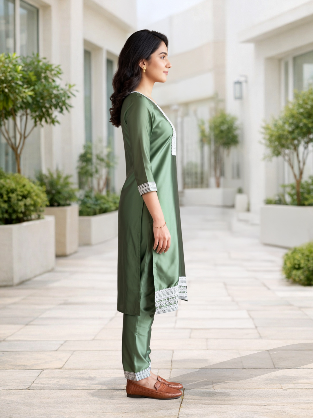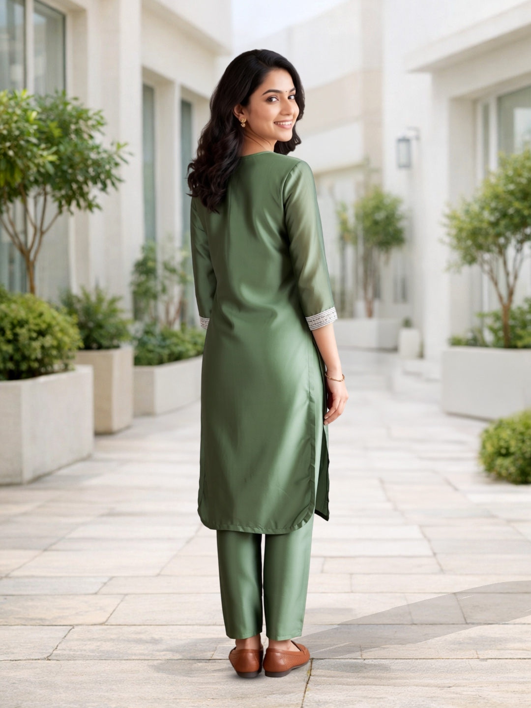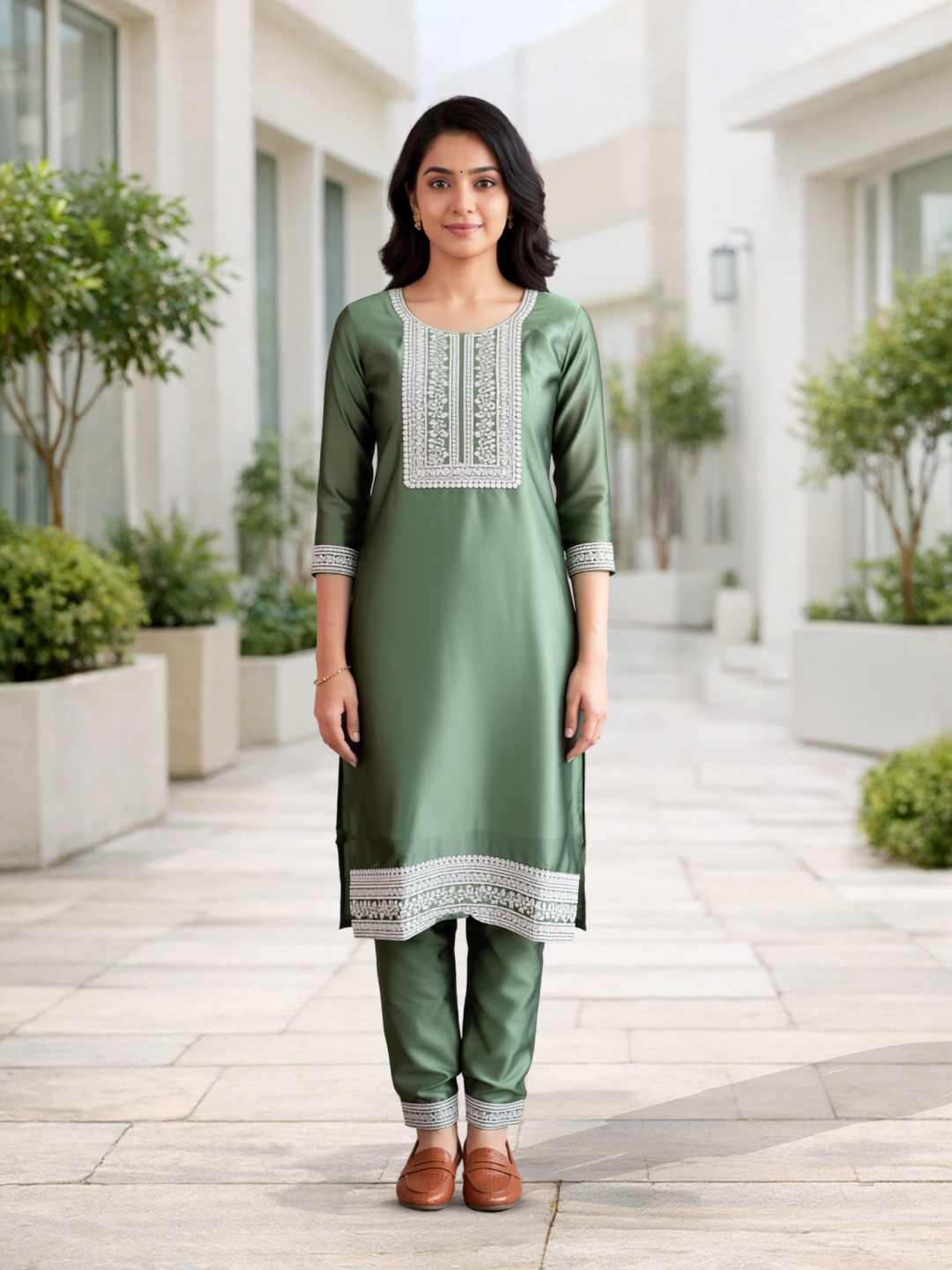Designed with a flattering straight-cut fit, this kurta set offers both style and ease of movement. The 3/4th sleeves enhance comfort, while the coordinated pants with border detailing create a neat and structured finish. A perfect blend of modern simplicity and ethnic charm.