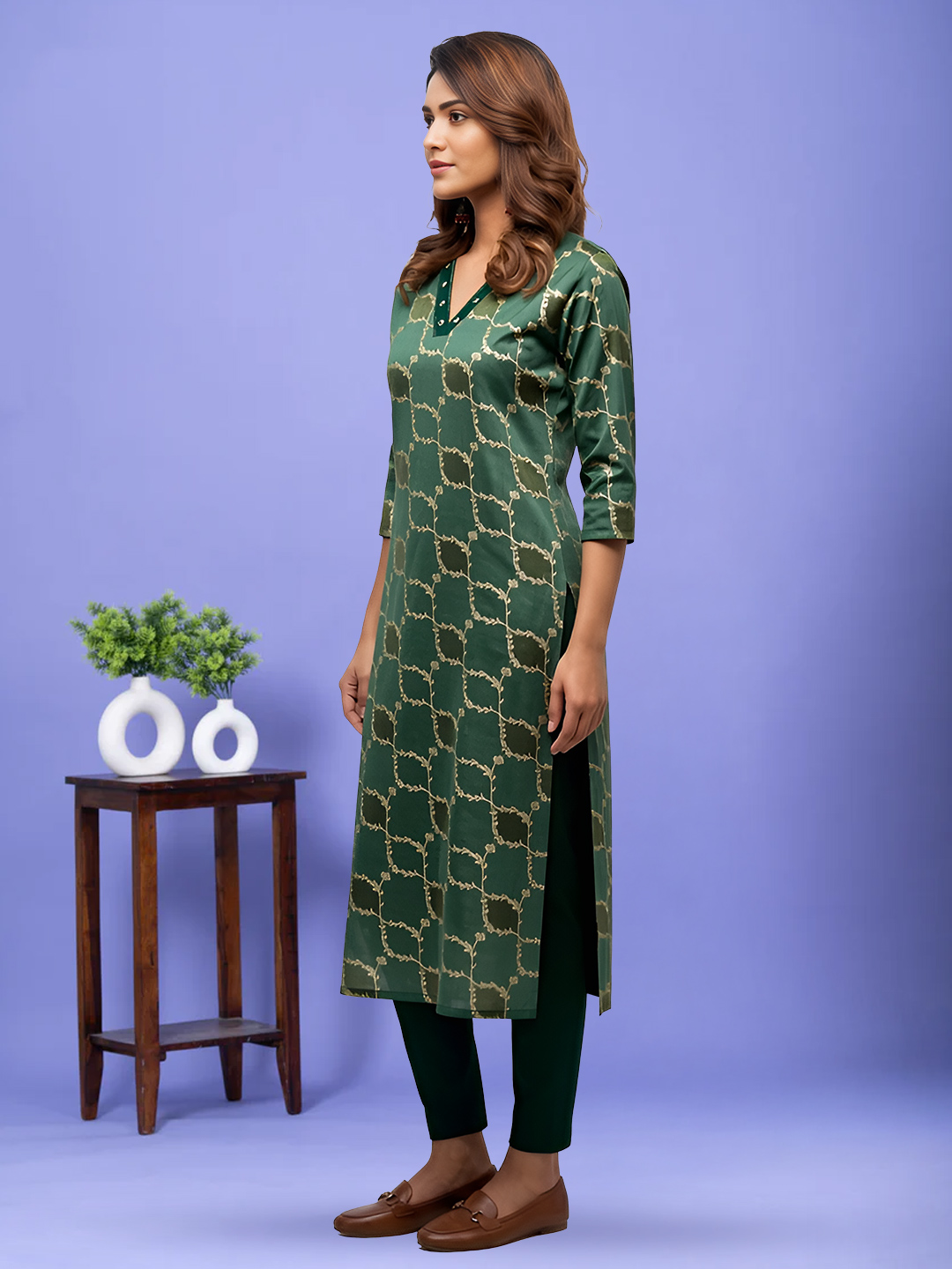 Step into effortless elegance with this straight-cut salwar suit set featuring a graceful V-neckline. The gold-toned vine pattern lends a luxurious festive touch, beautifully complementing the premium breathable fabric.