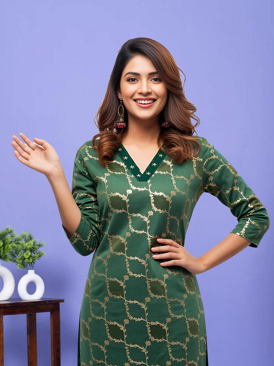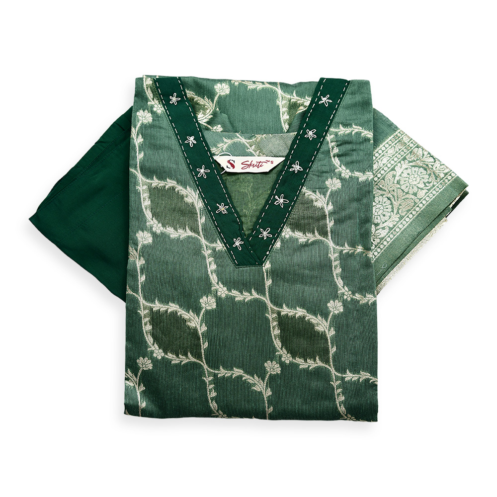 This Traditional V-Neck Salwar Suit Set blends understated glamour with contemporary tailoring. The delicate gold vine pattern enhances the richness of the design, offering just the right amount of festive shine.