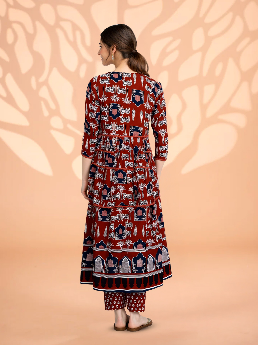 Step into heritage-inspired elegance with this V-neck printed salwar suit set. Crafted from a soft and breathable cotton blend, it features all-over traditional block-style prints, detailed embroidery at the neckline, and a matching printed dupatta for a complete ethnic look.