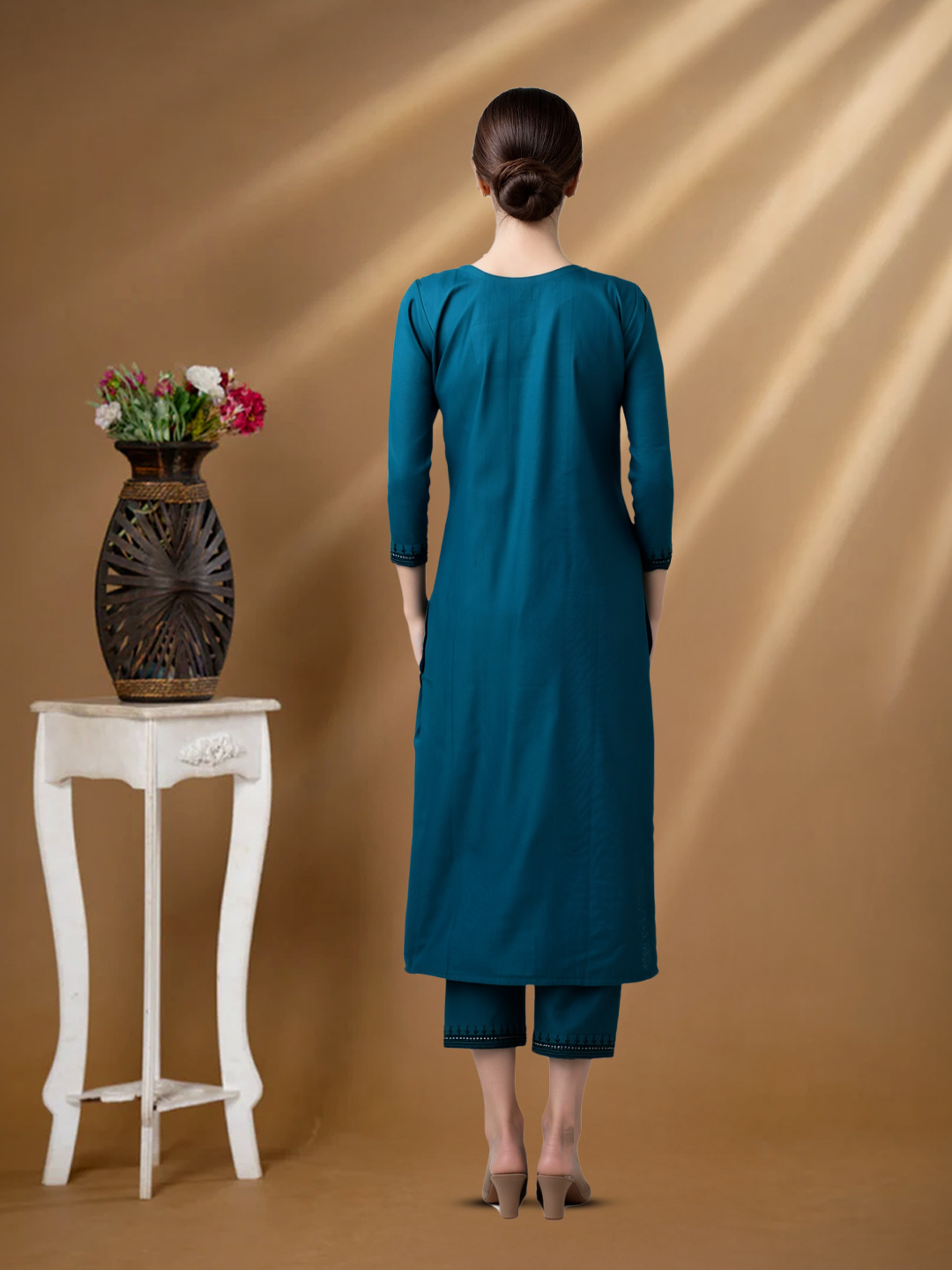 Designed with a straight-cut kurta and matching pants, this set ensures comfort without compromising style. The flattering silhouette and breathable fabric make it perfect for all-day wear, from family gatherings to formal events.