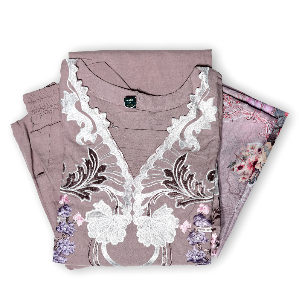 Turn heads with this embroidered V-neck kurta set, crafted from premium fabric for a luxurious feel. The intricate embroidery and eye-catching design make it perfect for festive occasions, while the matching straight pant and coordinated dupatta complete this graceful ensemble.