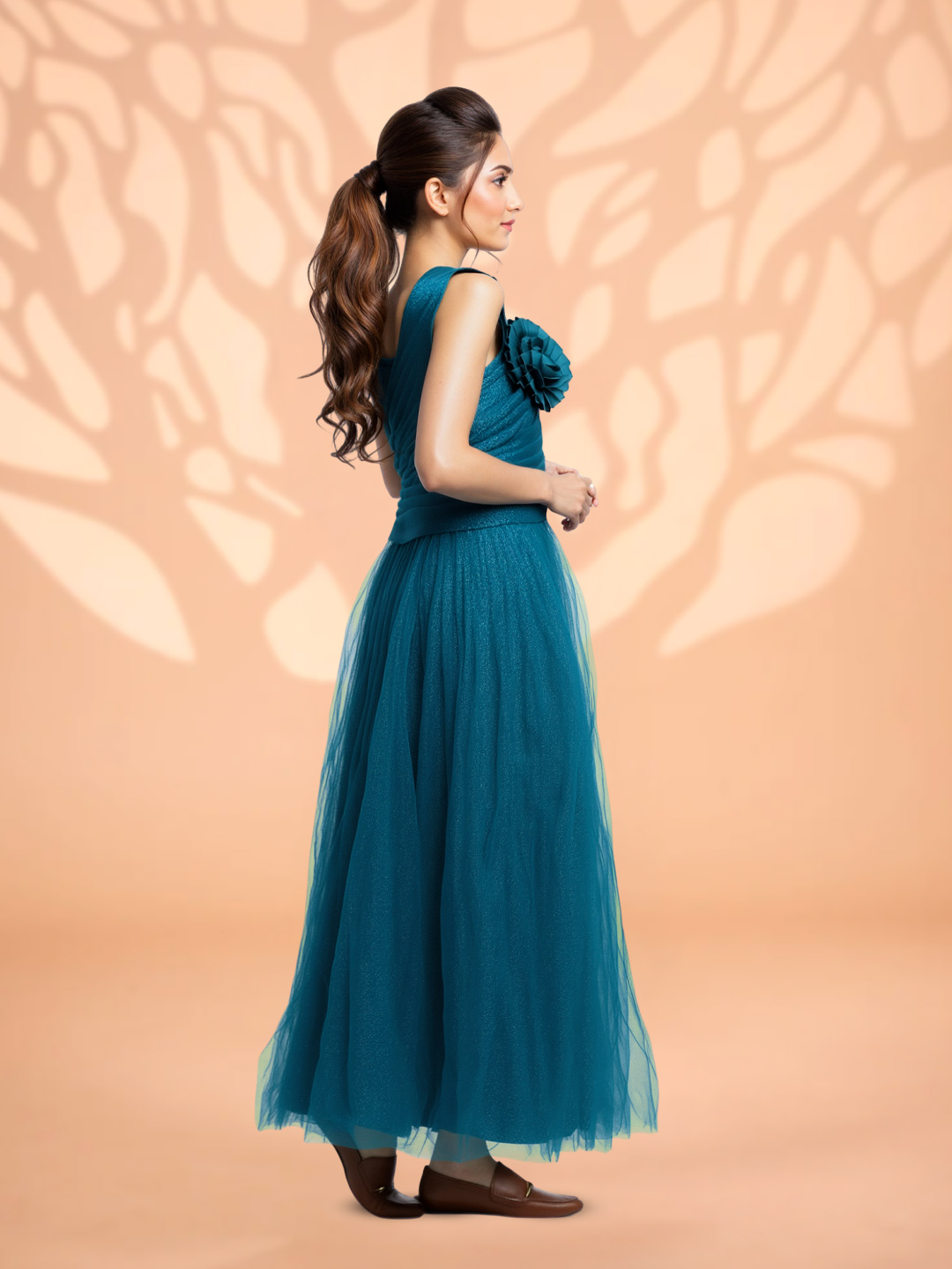 This floral appliqué net gown is designed to make a graceful statement. Delicate floral detailing on the bodice adds a romantic charm, creating a look that is both elegant and eye-catching.