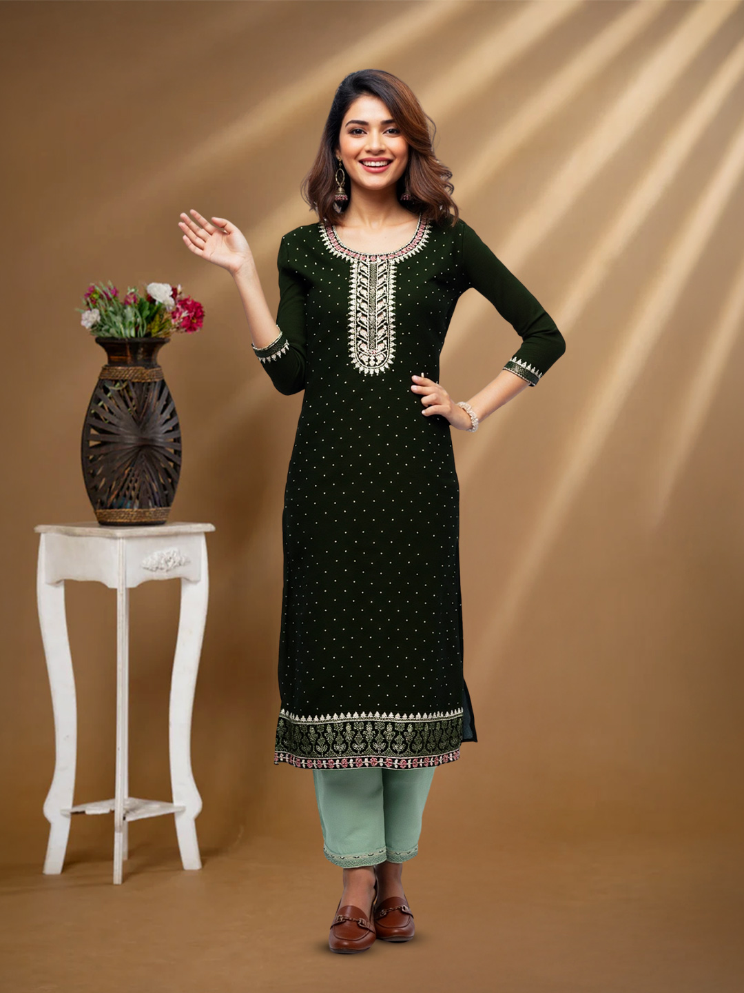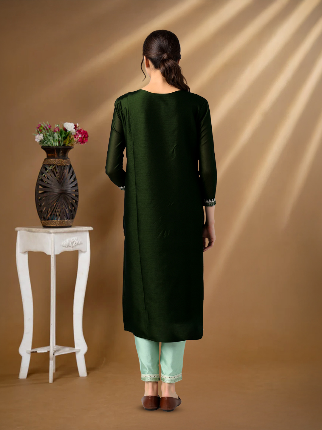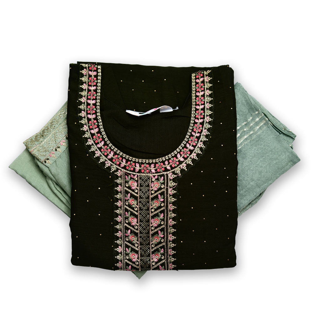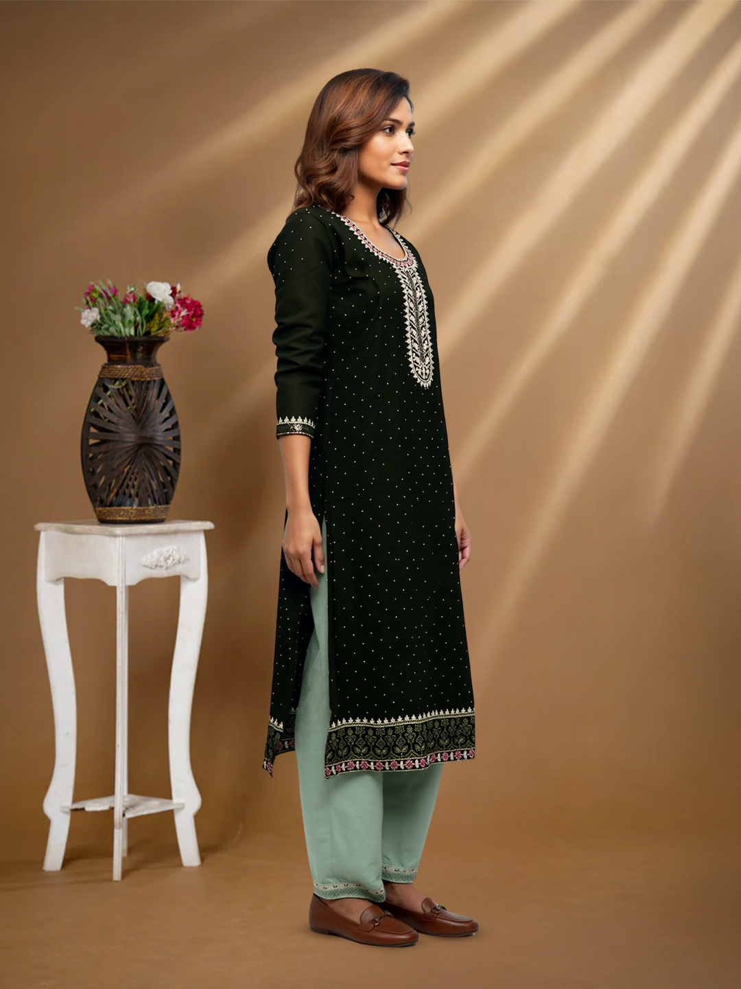 Whether you’re attending a wedding, a festival, or a casual gathering, this kurta set is designed to make you feel effortlessly chic. The floral embroidery and mint-green dupatta bring vibrancy to the dark green fabric, while the straight-cut fit ensures all-day comfort. It’s a versatile outfit that transitions smoothly from day to night.