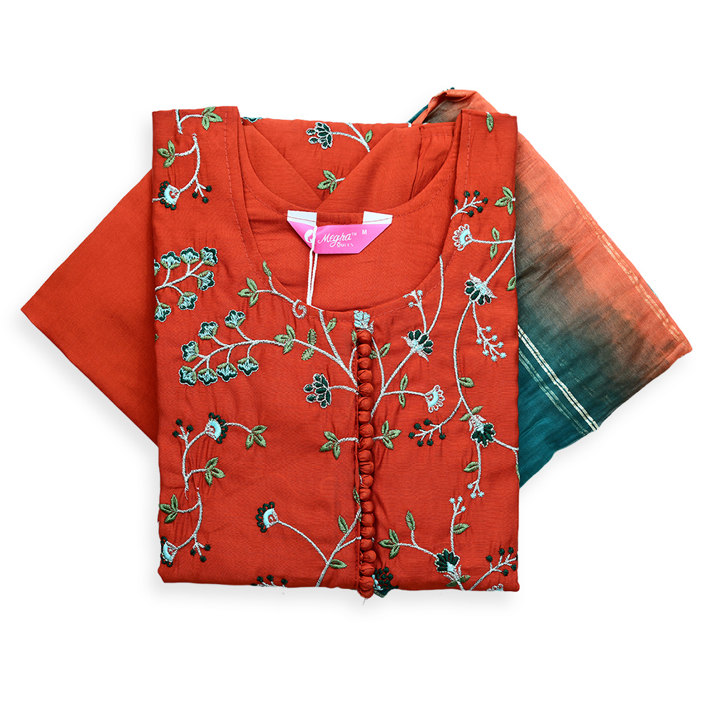 This beautiful outfit includes a floral embroidered kurta, matching pants, and a stylish dupatta, giving you a perfectly coordinated traditional look in one set.