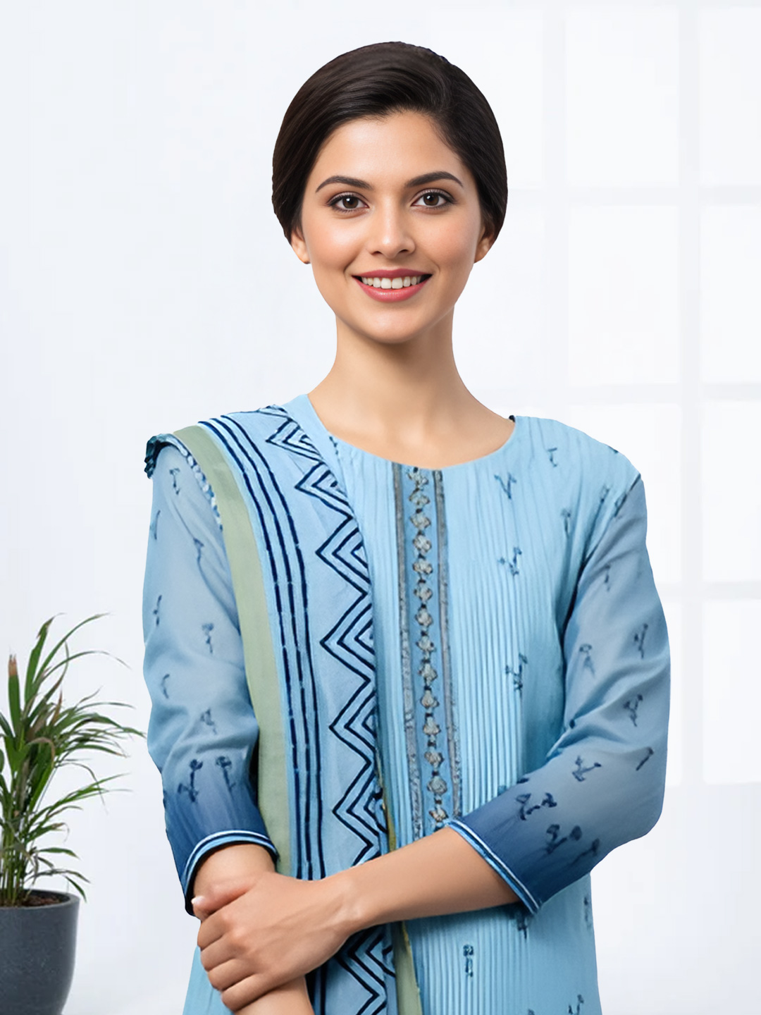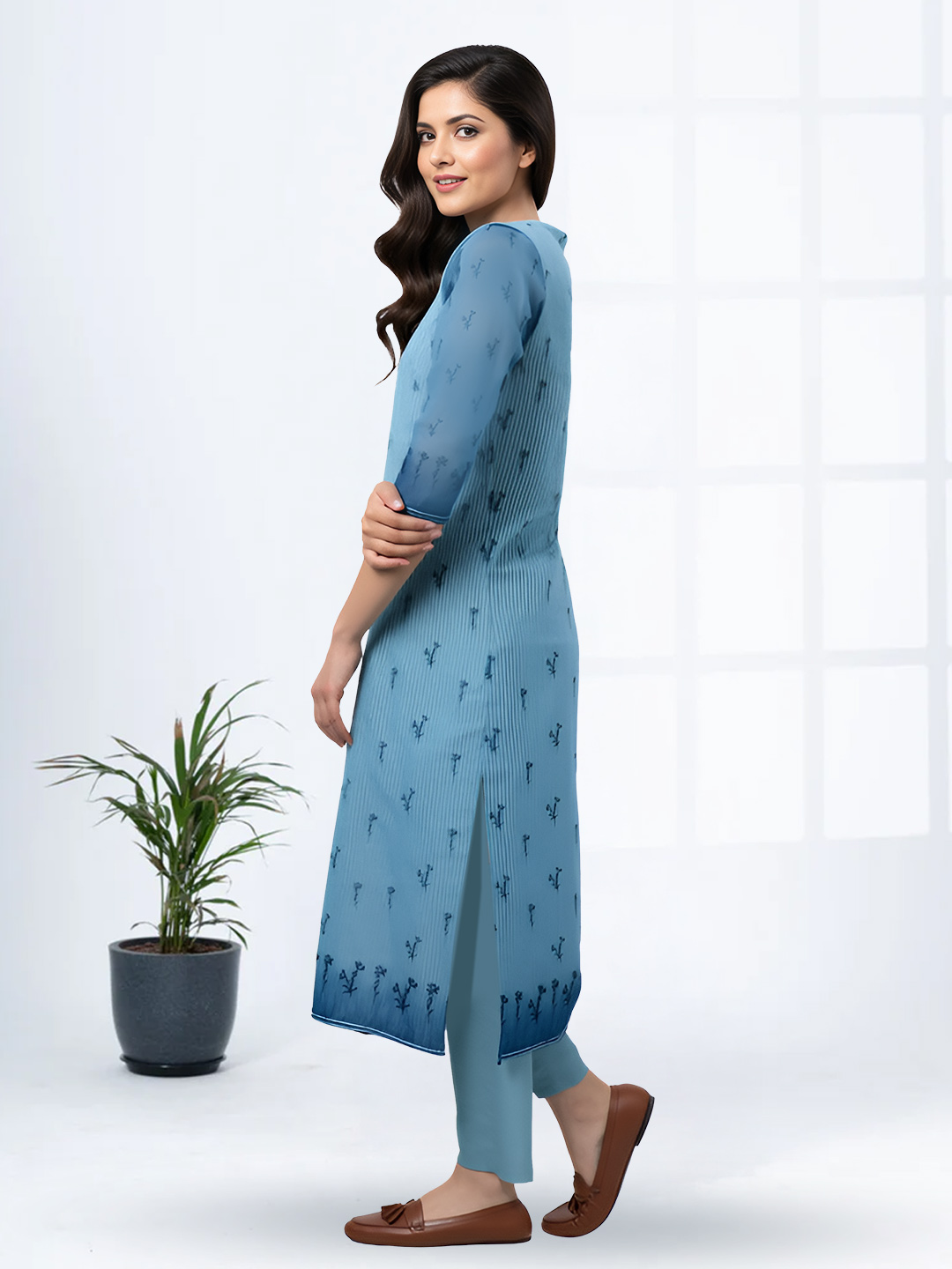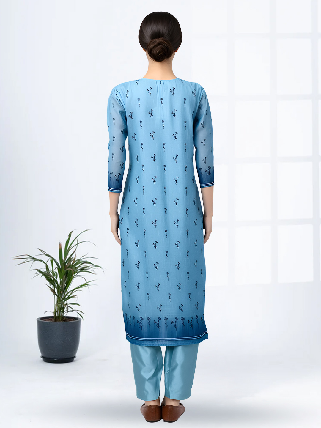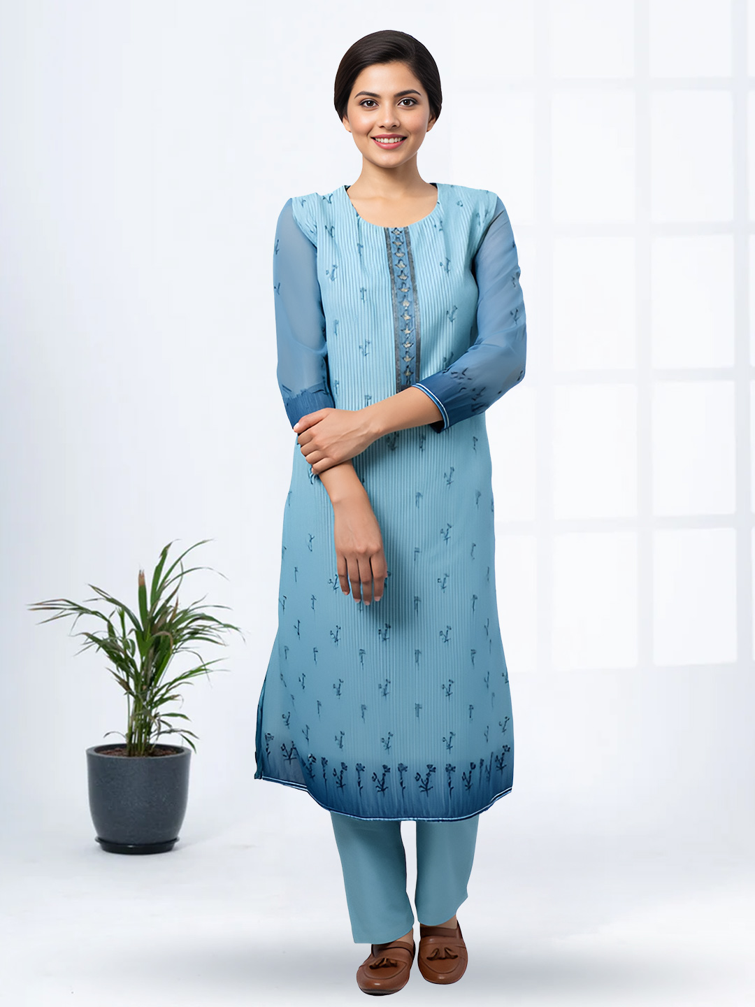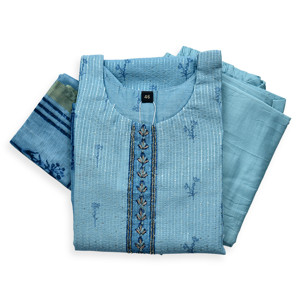 The soft blue kurta features minimal floral embroidery paired with a clean, straight-cut design. Its flattering silhouette creates a refined and graceful look suitable for both casual and festive occasions.
