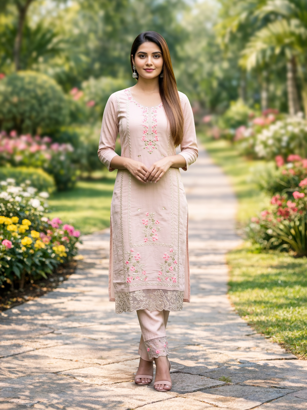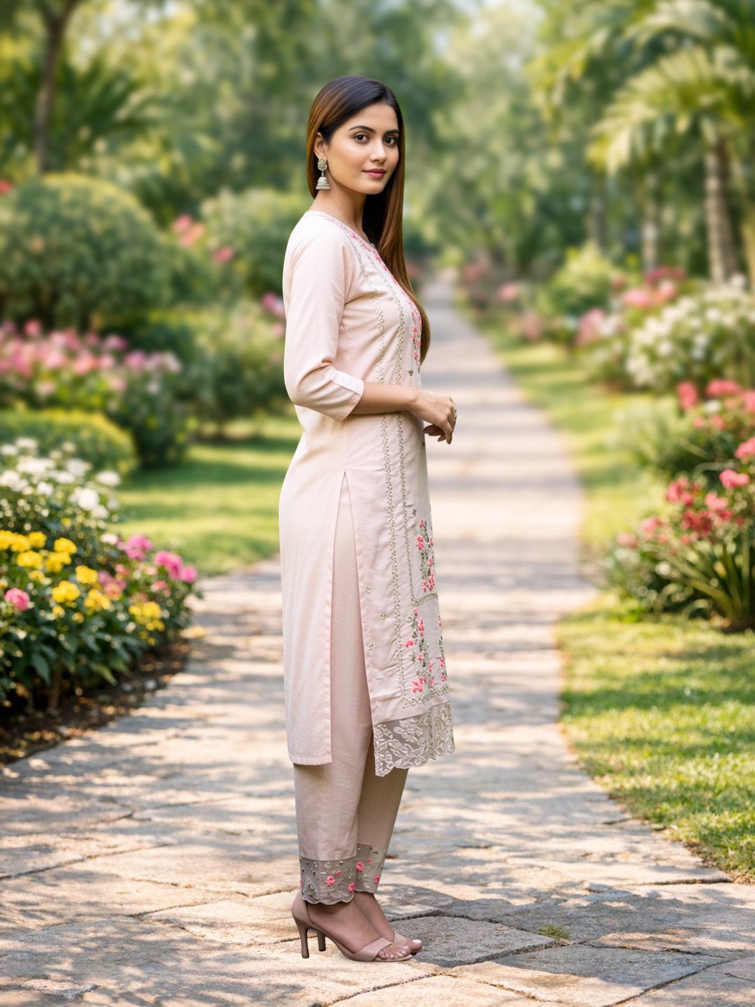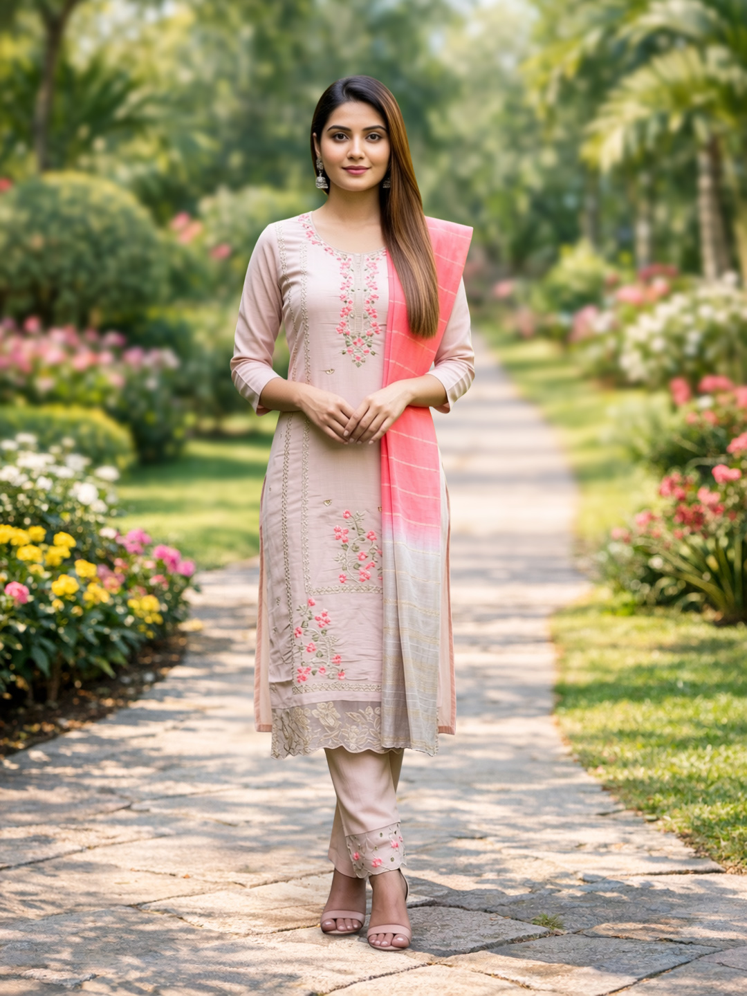 Featuring a flattering straight-cut silhouette and elegant three-quarter sleeves, this suit blends traditional embroidery with contemporary styling. A versatile addition to your ethnic wardrobe, designed to make every occasion memorable.