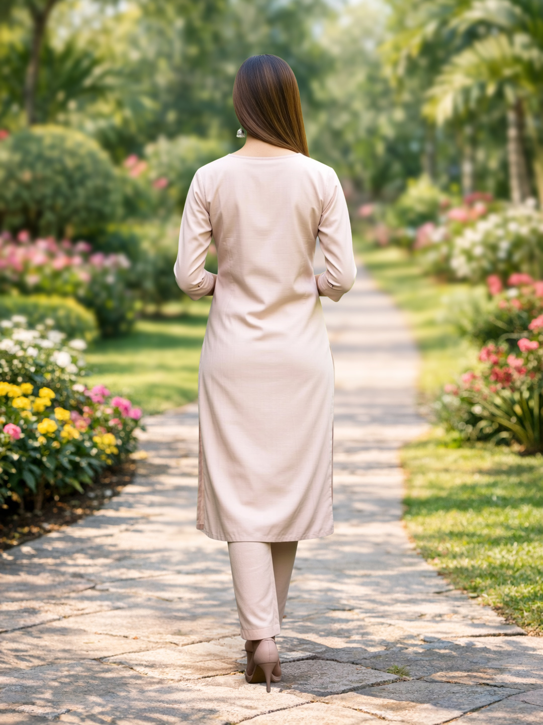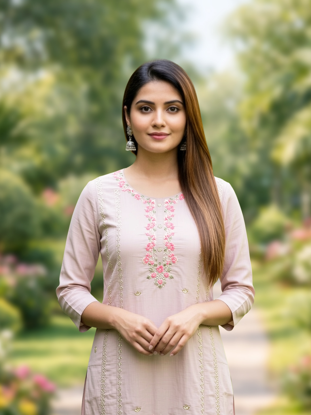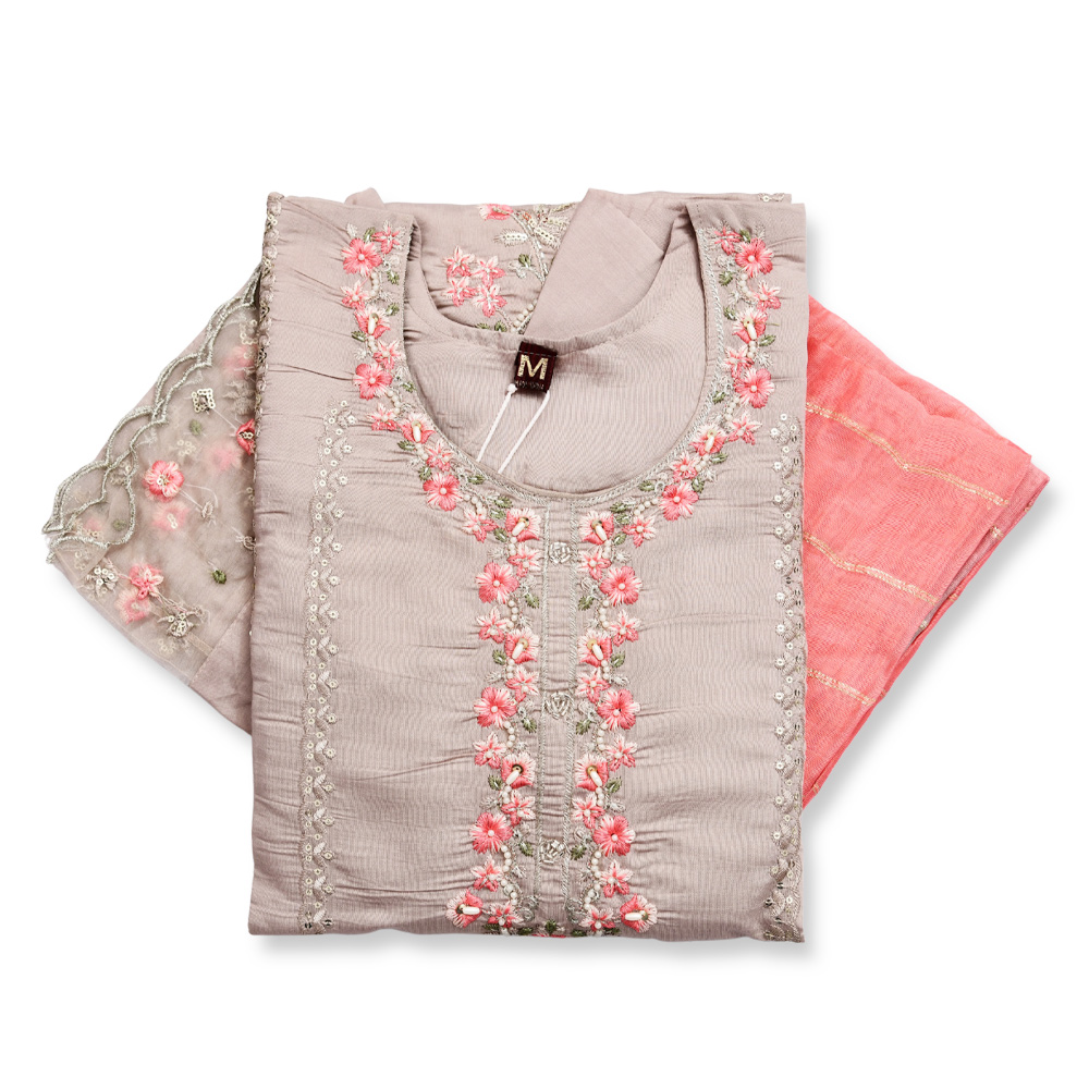 Featuring a flattering straight-cut silhouette and elegant three-quarter sleeves, this suit blends traditional embroidery with contemporary styling. A versatile addition to your ethnic wardrobe, designed to make every occasion memorable.