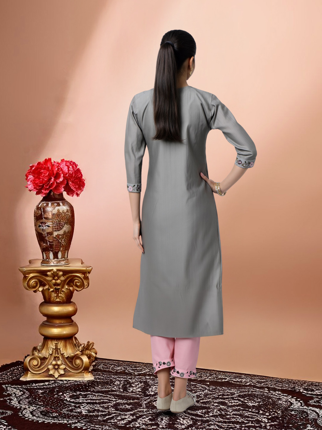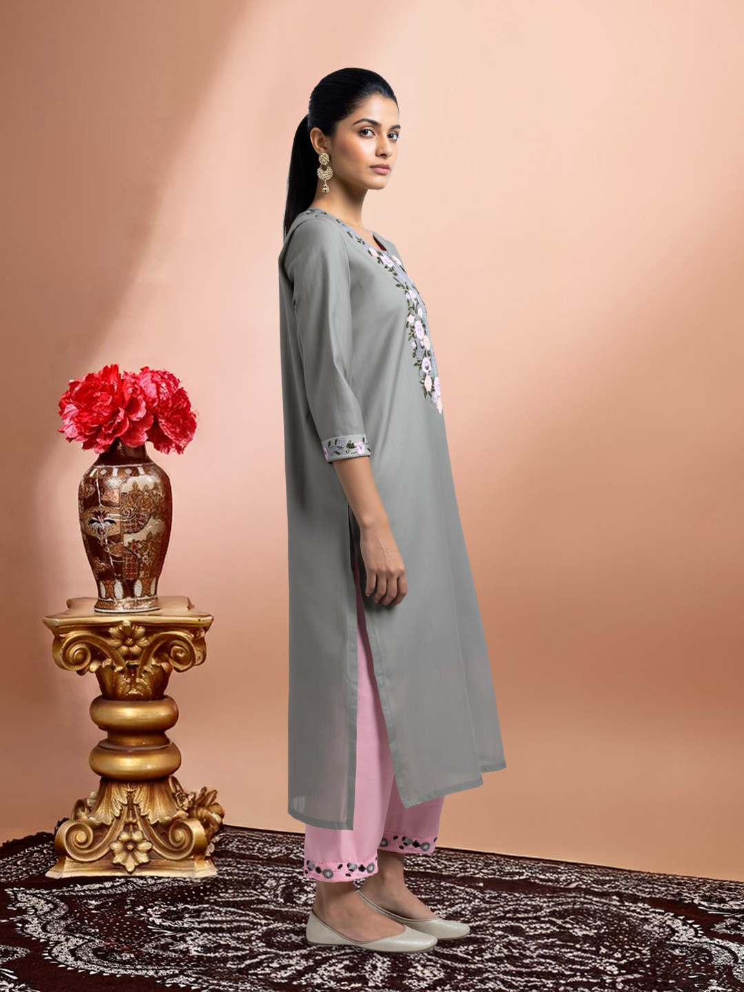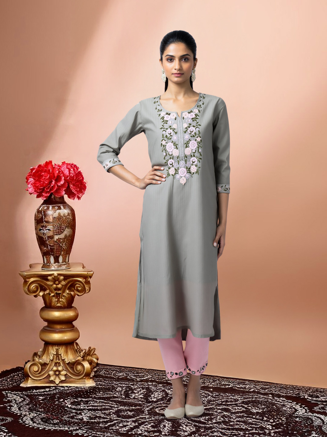 Embrace the art of understated beauty with this Floral Embroidery Kurta with Pant Set. The notched neckline and straight-cut silhouette create a sleek, modern look, while the matching churidar pants offer a perfect fit. The lightweight dupatta with its delicate drape completes this stunning, comfortable outfit—ideal for festive and formal occasions.