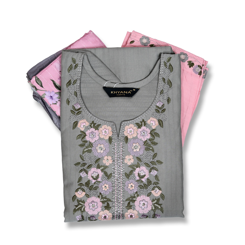 This beautifully crafted straight-cut kurta set features a floral embroidery design that adds a delicate touch of nature-inspired charm. The notched neckline and matching churidar pants with coordinated embroidery bring out the ensemble’s fine details. The lightweight dupatta adds a soft, flowing finish, perfect for all-day comfort and style.
