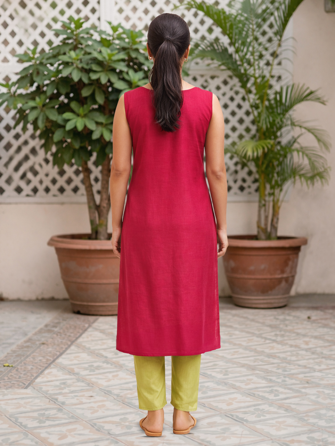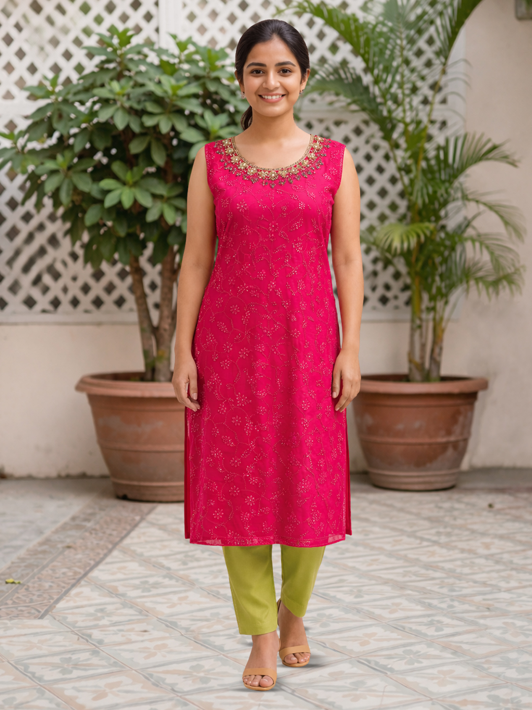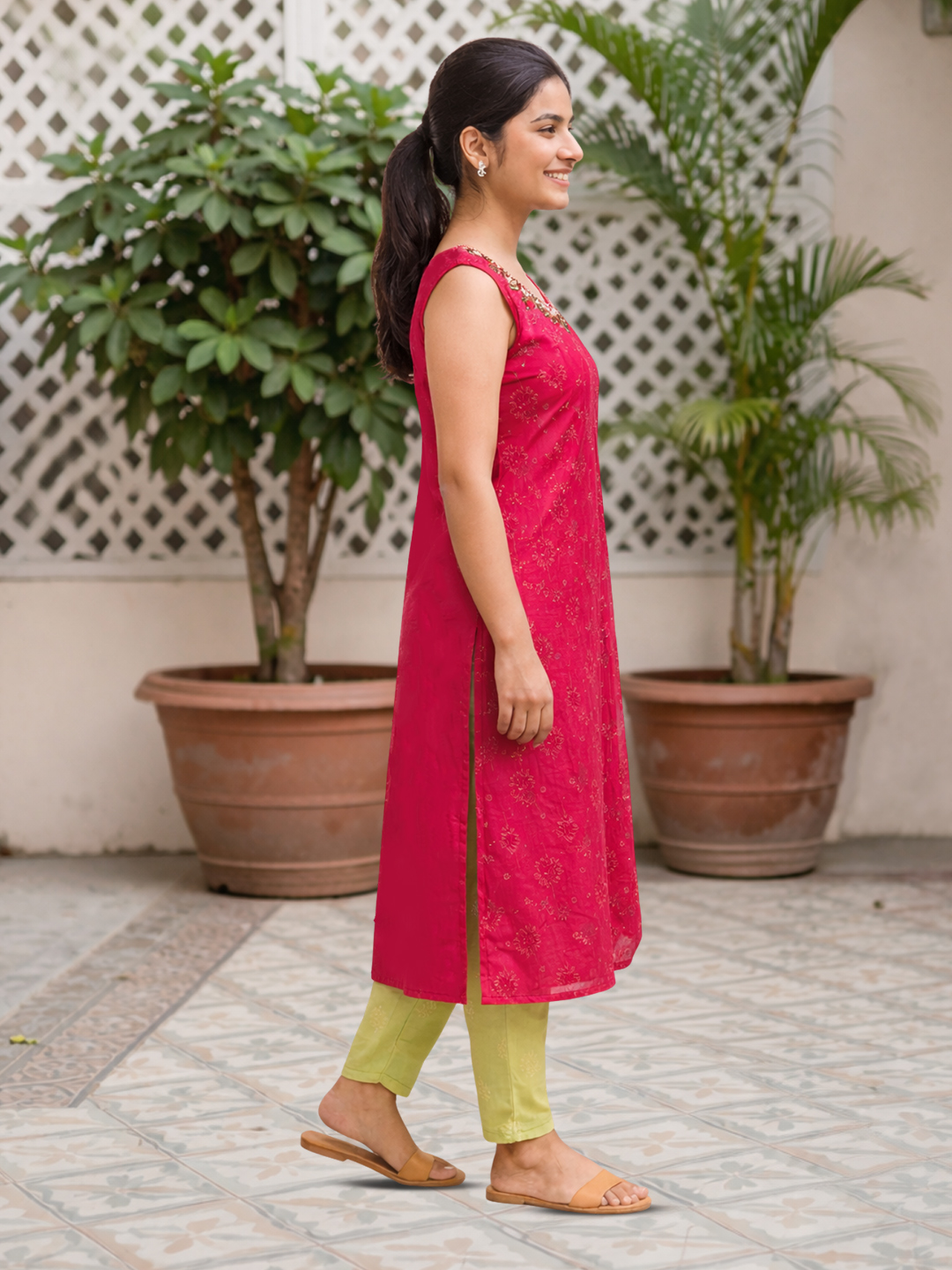 Unleash your inner radiance with this stunning salwar suit set. The rich red kurta features intricate floral embroidery and sequins, creating a striking contrast against the lime green dupatta. The sleeveless straight-cut kurta offers ultimate comfort and ease of movement, making it the perfect choice for festive occasions.