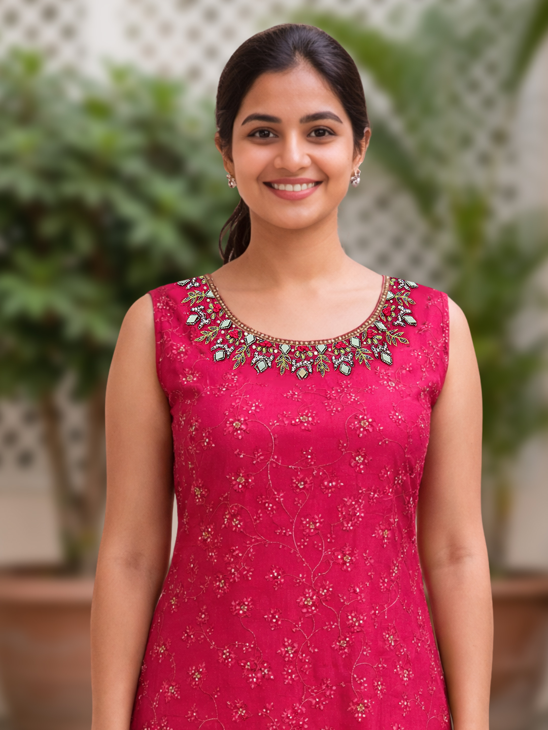 Step into the spotlight with this exquisite floral embroidery and sequins salwar suit set. The fine craftsmanship on the red kurta and the stylish lime green dupatta make this set a must-have. The soft, breathable fabric and sleeveless design ensure that you stay comfortable while looking effortlessly chic.