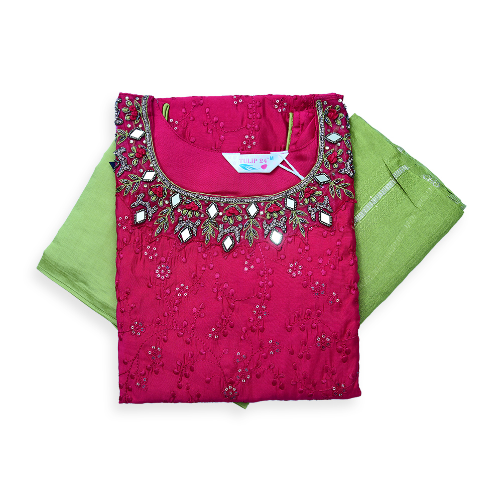 Add a burst of color and elegance to your wardrobe with this floral embroidery sequins mirror work salwar suit set. The red kurta, embellished with intricate floral designs and sequins, is complemented by a lively lime green dupatta with gold accents. Designed for comfort and style, this set is perfect for every occasion.
