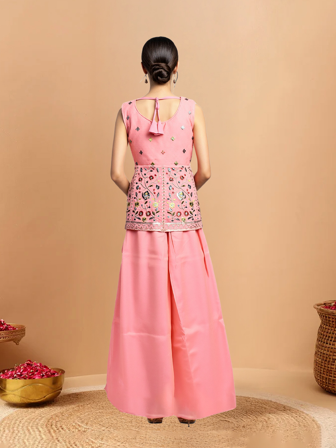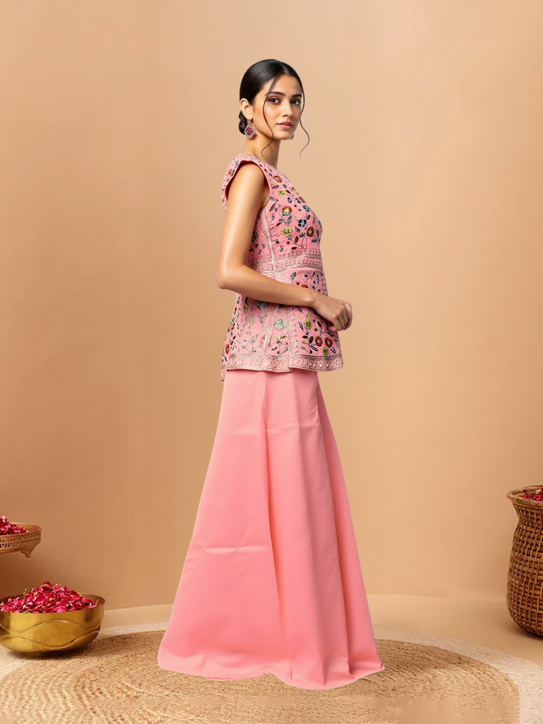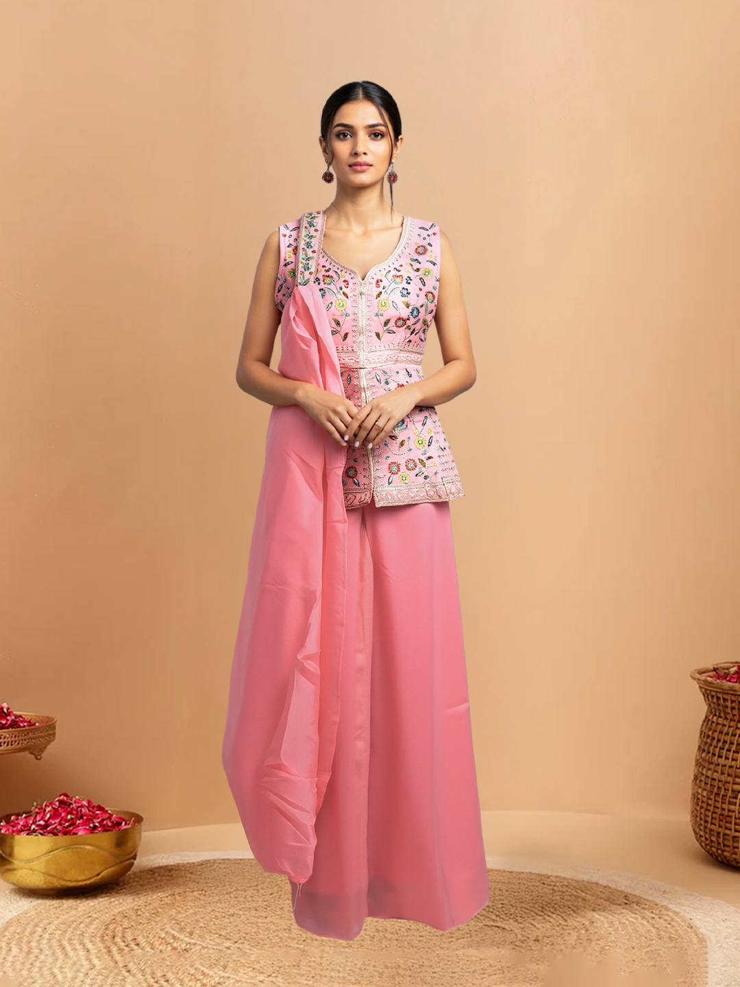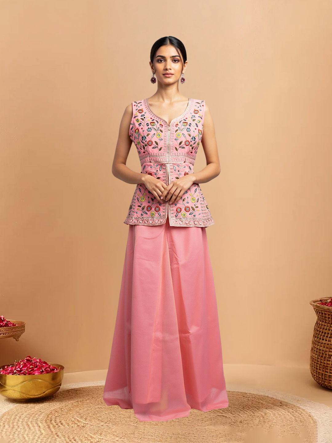 Blending tradition with modern style, this floral embroidery shimmer kurta set includes a sleeveless V-neck kurta, flowy sharara pants, and a sheer dupatta. Designed for parties, festive wear, and traditional events, it offers a refined and stylish ethnic look.