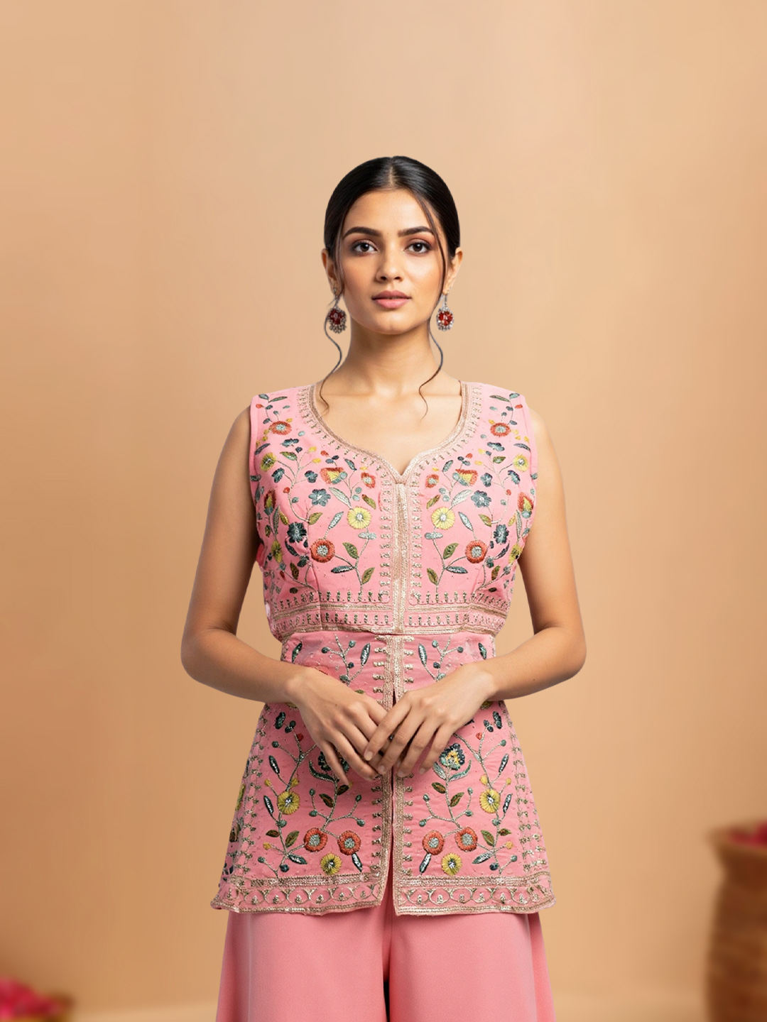 Make a graceful statement with this floral embroidery shimmer short kurta set. Designed with a sleeveless silhouette and a flattering V-neckline, the kurta is paired with flowy sharara pants and a lightweight sheer dupatta—perfect for weddings, festive gatherings, and traditional functions.