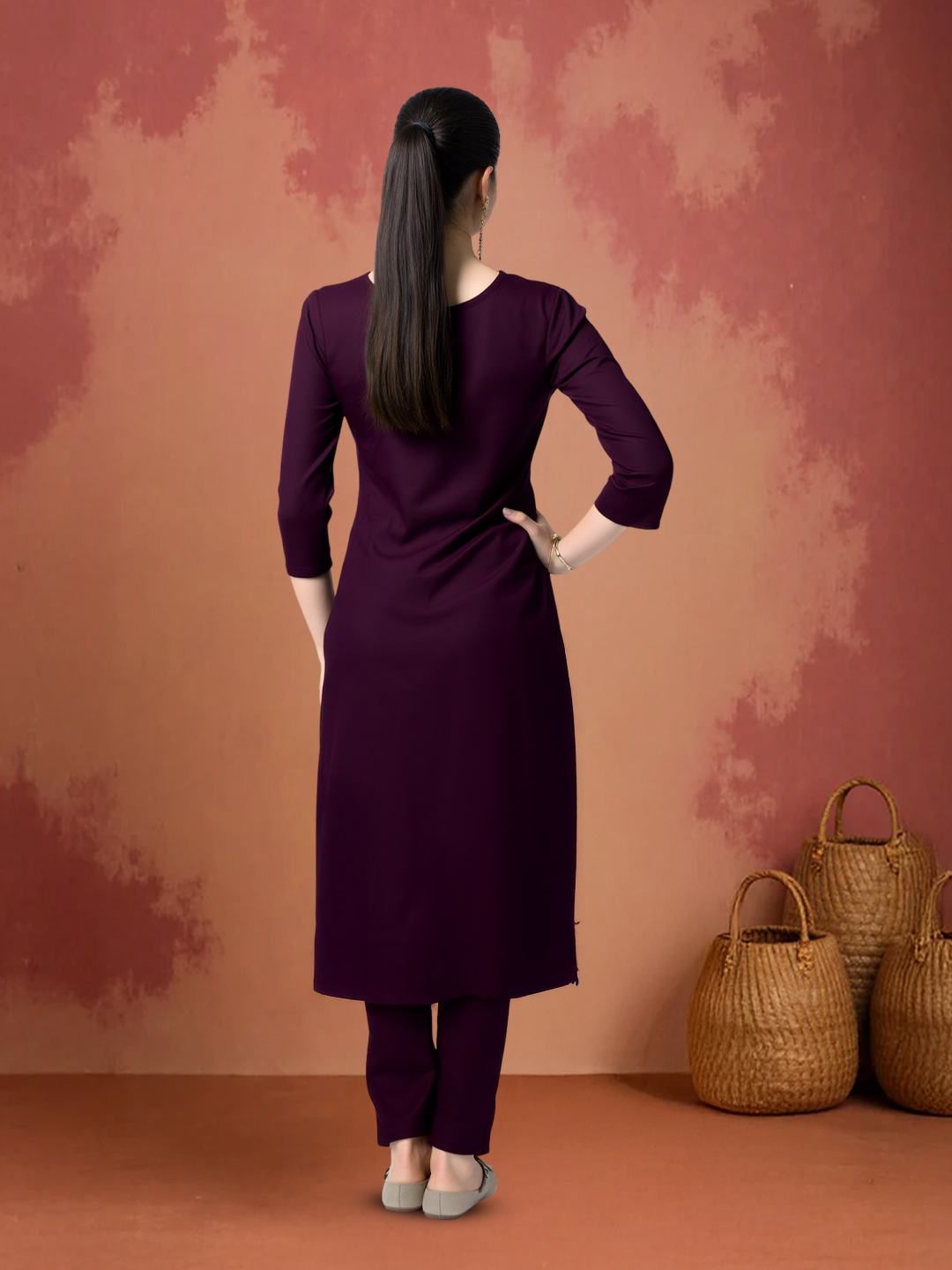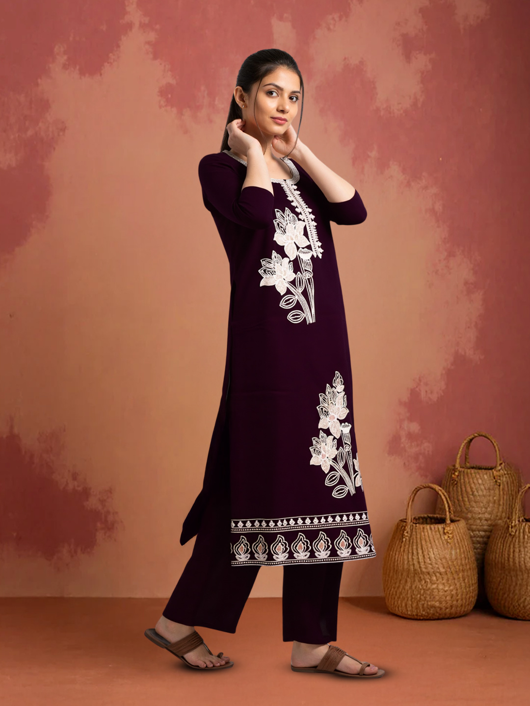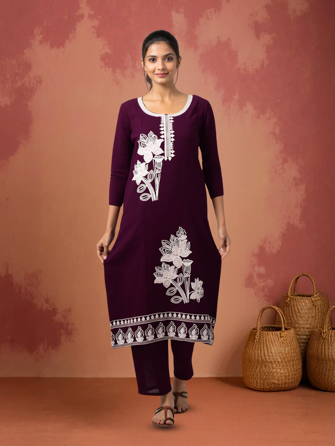 Bring sophistication to your look with this straight-cut kurta set featuring floral embroidery. Crafted from premium-quality fabric, the set includes a matching straight pant and lightweight dupatta, making it a perfect blend of comfort, style, and tradition.