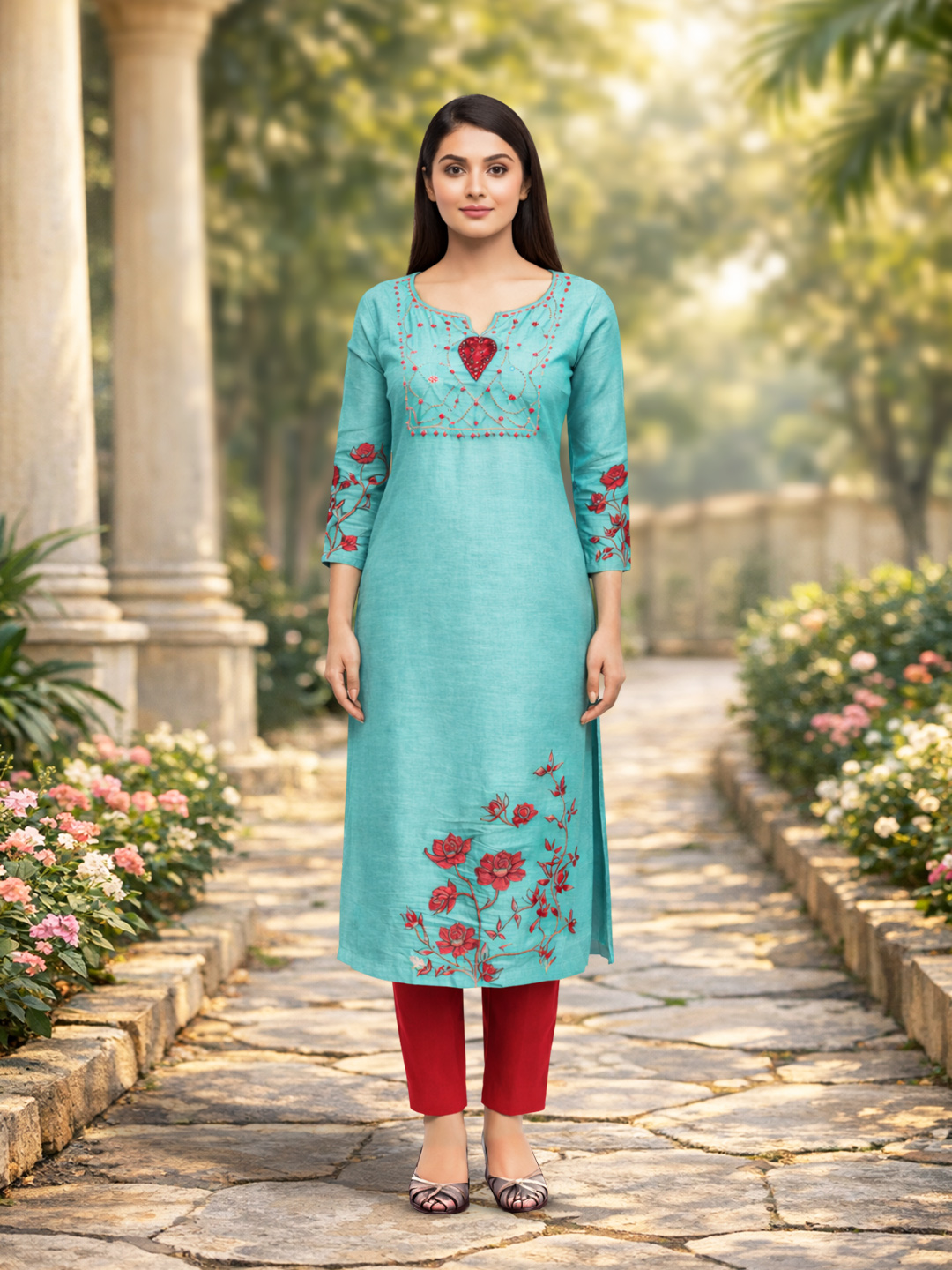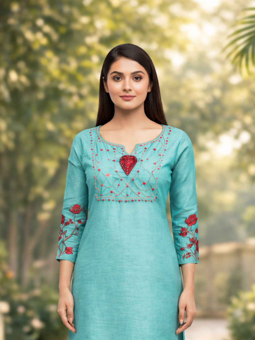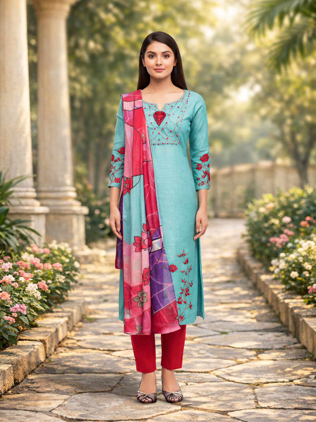 Stand out effortlessly in this beautifully crafted kurta set. Featuring a distinctive heart-shaped neckline and delicate embroidery, it brings a refreshing twist to traditional wear. The breathable fabric ensures all-day comfort, while the colorful dupatta enhances its stylish appeal.
