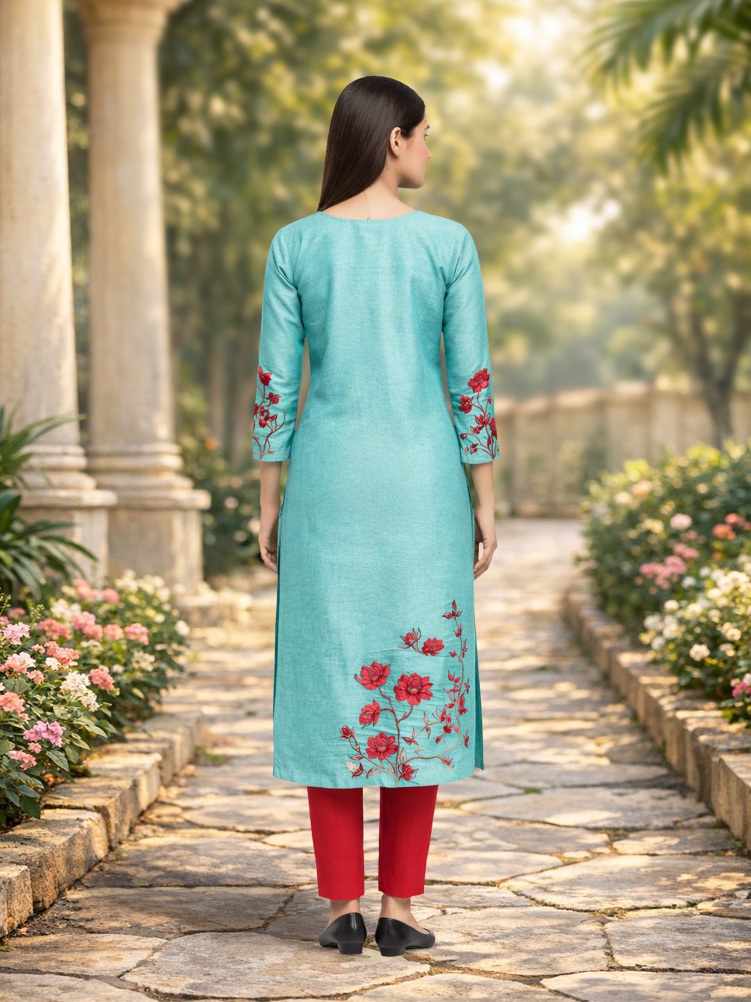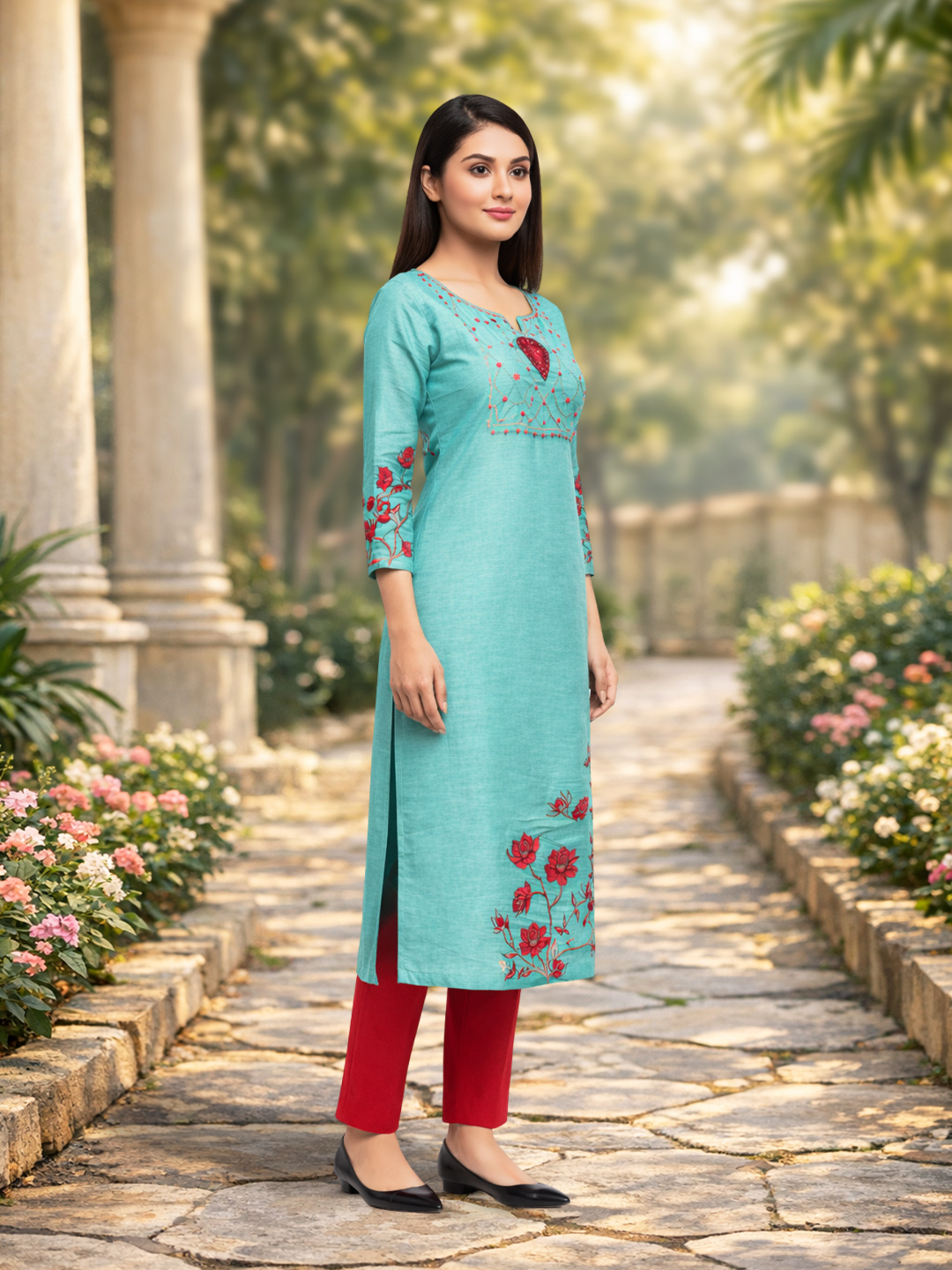 Elevate your wardrobe with this chic and contemporary salwar suit set. The sea green kurta showcases fine embroidery and a uniquely designed neckline, complemented by floral accents on the sleeves. Finished with a lively printed dupatta, it’s the perfect mix of modern flair and ethnic charm.