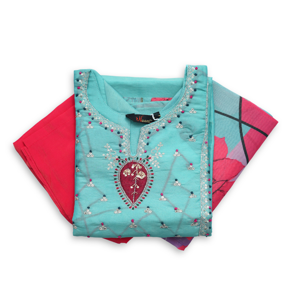 Add a fresh and stylish piece to your collection with this embroidered salwar suit set. The eye-catching neckline and soft fabric make it both fashionable and comfortable. With its 3/4 sleeves and beautifully printed dupatta, this outfit ensures you look polished and feel confident all day long.